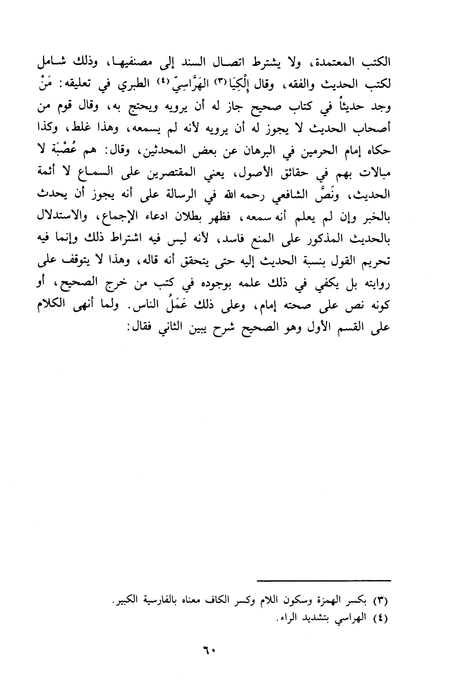 الكتب المعتمدة، ولا يشترط اتصال السَّند إلى مصنفيها، وذلك شامل لكتب الحديث والفقه، وقال إِلْكِيَا (¬1) الهَرَّاسِيّ (¬2) الطبري في تعليقه: مَنْ وجد حديثاً في كتاب صحيح جاز له أن يرويه ويحتج به. وقال: قوم من أصحاب الحديث لا يجوز له أن يرويه لأنه لم يسمعه، وهذا غلط، وكذا حكاه إمام الحرمين في البرهان عن بعض المحدثين, وقال: هم عُصْبَة لا مبالات بهم في حقائق الأصول، يعني المقتصرين على السماع لا أئمة الحديث، ونَصَّ الشافعي رحمه الله في الرسالة على أنه يجوز أن يحدث بالخبر وإن لم يعلم أنه سمعه، فظهر بطلان ادعاء الإجماع، والاستدلال بالحديث المذكور على المنع فاسد، لأنه ليس فيه اشتراط ذلك وإنما فيه تحريم القول بنسبة الحديث إليه حتى يتحقق أنه قاله، وهذا لا يتوقف على روايته بل يكفي في ذلك علمه بوجوده في كتب من خرج الصَّحِيح، أو كونه نص على صحته إمام، وعلى ذلك عَمَلُ الناس. ولما أنهي الكلام على القسم الأول وهو الصَّحِيح شرح يبين الثاني فقال: