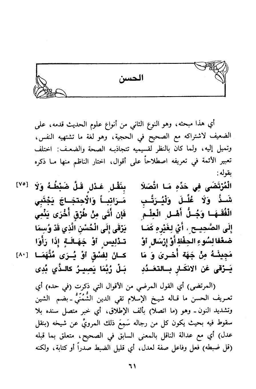 أي هذا مبحثه، وهو النوع الثاني من أنواع علوم الحديث قدمه، على الضَّعِيف لاشتراكه مع الصَّحِيح في الحجية، وهو لغة ما تشتهيه النفس, وتميل إليه، ولما كان بالنظر لقسيميه تتجاذبه الصحة والضعف: اختلف تعبير الأئمة في تعريفه اصطلاحاً على أقوال، اختار الناظم منها ما ذكره بقوله: