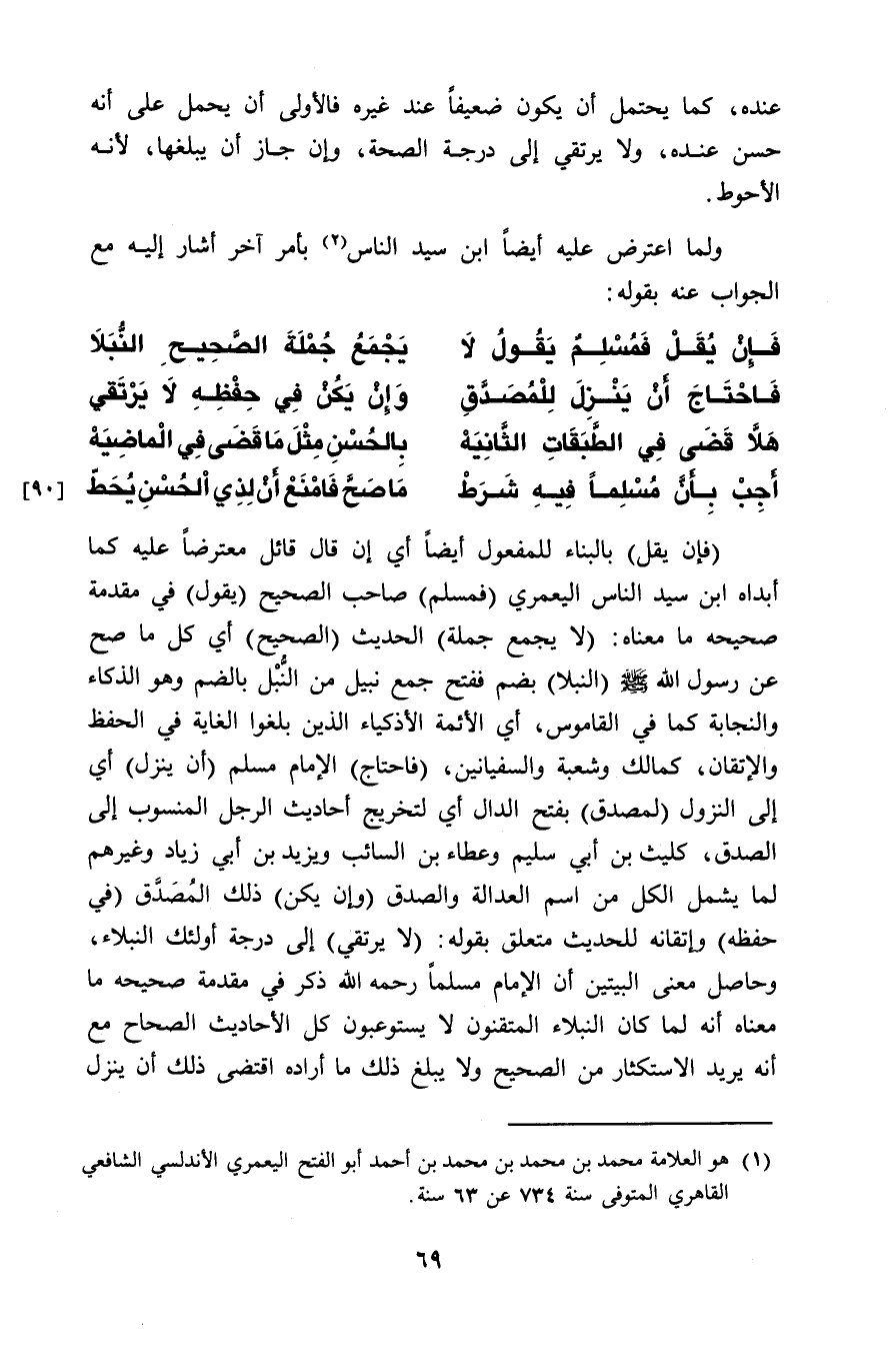 (فإن يقل) بالبناء للمفعول أيضاً أي إن قال قائل معترضاً عليه كما أبداه ابن سيد النَّاس اليعمري (فمسلم) صاحب الصَّحِيح (يقول) في مقدمة صحيحه ما معناه: (لا يجمع جملة) الحديث (الصَّحِيح) أي كل ما صح عن رسول الله - صلى الله عليه وسلم - (النبلا) بضم ففتح جمع نبيل من النُّبْل بالضم وهو الذكاء والنجابة كما في القاموس، أي الأئمة الأذكياء الذين بلغوا الغاية في الحفظ والإتقان، كمالكٍ وشعبة والسفيانين. (فاحتاج) الإمام مسلم (أن ينزل) أي إلى النزول (لْمُصَدَّقِ) بفتح الدال أي لتخريج أحاديث الرجل المنسوب إلى الصدق، كليث بن أبي سليم وعطاء بن السائب ويزيد بن أبي زياد وغيرهم لما يشمل الكل من اسم العدالة والصدق (وإن يكن) ذلك المُصَدَّق (في حفظه) وإتقانه للحديث متعلق بقوله: (لا يرتقي) إلى درجة أولئك النبلاء، وحاصل معنى البيتين أن الإمام مسلماً رحمه الله ذكر في مقدمة صحيحه ما معناه أنه لما كان النبلاء المتقنون لا يستوعبون كل الأحاديث الصحاح مع أنه يريد الاستكثار من الصَّحِيح ولا يبلغ ذلك ما أراده اقتضى ذلك أن ينزل