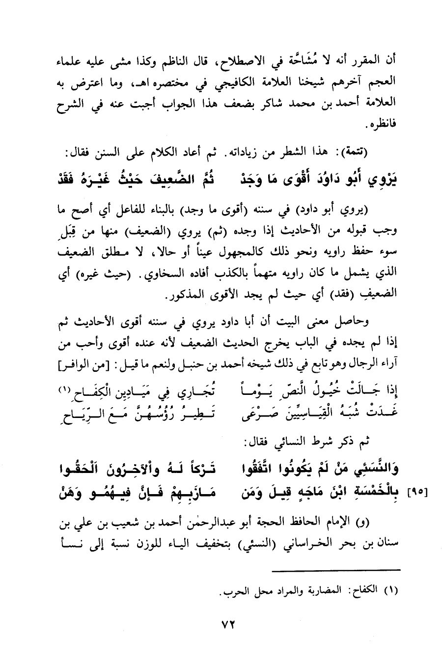 أن المقرر أنه لا مُشَاحَّة في الاصطلاح، قال الناظم وكذا مشى عليه علماء العجم آخرهم شيخنا العلامة الكافيجي في مختصره. اهـ, وما اعترض به العلامة أحمد بن محمد شاكر بضعف هذا الجواب أجبت عنه في الشرح فانظره.