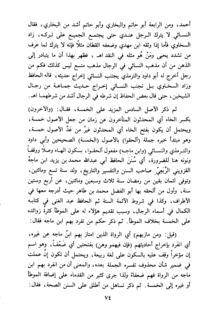 ثم ذكر الأصل السادس المزيد على الخمسة، فقال: (والآخرون) بكسر الخاء أي المحدثون المتأخرون عن زمان من جعل الأصول خمسة، ويحتمل أن يكون بفتح الخاء أي المحدثون غيرُ من عَدَّ الأصول خمسة، وهو مبتدأ خبره جملة (ألحقوا) بالأصول (الخمسة) الصَّحِيحين وأبي داود والترمذي والنسائي (وابن ماجه) مفعول ألحقوا، بسكون الهاء وصلاً ووقفاً ونونه هنا للضرورة، أي سُنَنَ الحافظ أبي عبد الله محمد بن يزيد ابن ماجهْ القزويني الرَّبَعِيِّ صاحب السنن والتفسير والتاريخ، ولد سنة تسع ومائتين، وتوفي لثمان بقين من رمضان سنة ثلاث وسبعين ومائتين، عن أربع وستين سنة، وأول من ألحقه بها أبو الفضل محمد بن طاهر حيث أدرجه معها في الأطراف، وكذا في شروط الأئمة الستة ثم الحافظ عبد الغني في كتابه الكمال في أسماء الرجال، وسبب تقديم هؤلاء له على الموطأ كثرةُ زوائده على الخمسة بخلاف الموطأ. ثم ذكر حكم من تفرد بهم ابن ماجه فقال: