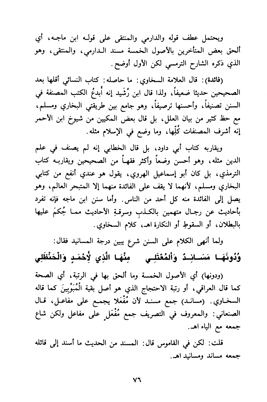 (فائدة): قال العلامة السخاوي: ما حاصله: كتاب النسائي أقلها بعد الصَّحِيحين حديثا ضعيفاً، ولذا قال ابن رُشَيد إنه أبدعُ الكتب المصنفة في السنن تصنيفاً، وأحسنها ترصيفاً، وهو جامع بين طريقتي البخاري ومسلم، مع حظ كثير من بيان العلل، بل قال بعض المكيين من شيوخ ابن الأحمر إنه أشرف المصنفات كُلِّها، وما وضع في الإسلام مثله.