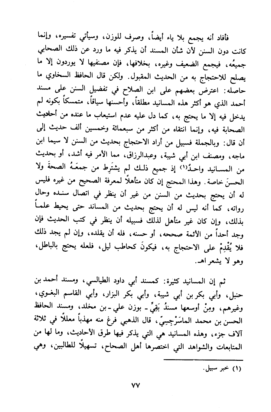 فأفاد أنه يجمع بلا ياء أيضاً، وصرف للوزن، وسيأتي تفسيره، وإنما كانت دون السنن لأن شأن المسند أن يذكر فيه ما ورد عن ذلك الصحابي جميعُه، فيجمع الضَّعِيف وغيره، بخلافها، فإن مصنفيها لا يوردون إلا ما يصلح للاحتجاج به من الحديث المقبول. ولكن قال الحافظ السخاوي ما حاصله: اعترض بعضهم على ابن الصلاح في تفضيل السنن على مسند أحمد الذي هو أكثر هذه المسانيد مطلقاً، وأحسنها سياقاً، متمسكاً بكونه لم يدخل فيه إلا ما يحتج به، كما دل عليه عدم استيعاب ما عنده من أحاديث الصحابة فيه، وإنما انتقاه من أكثر من سبعمائة وخمسين ألف حديث إلى أن قال: وبالجملة فسبيل من أراد الاحتجاج بحديث من السنن لا سيما ابن ماجه، ومصنف ابن أبي شيبة، وعبد الرزاق، مما الأمر فيه أشد، أو بحديث من المسانيد واحدٌ (¬1) إذ جميع ذلك لم يشتَرِط من جمعَهُ الصحةَ ولا الحسنَ خاصة. وهذا المحتج إن كان متأهلاً لمعرفة الصَّحِيح من غيره فليس له أن يحتج بحديث من السنن من غير أن ينظر في اتصال سنده وحال رواته، كما أنه ليس له أن يحتج بحديث من المساند حتى يحيط علماً بذلك، وإن كان غير متأهل لذلك فسبيله أن ينظر في كتب الحديث فإن وجد أحداً من الأئمة صححه، أو حسنه، فله أن يقلده، وإن لم يجد ذلك فلا يُقْدِمْ على الاحتجاج به، فيكونَ كحاطب ليل، فلعله يحتج بالباطل، وهو لا يشعر اهـ.