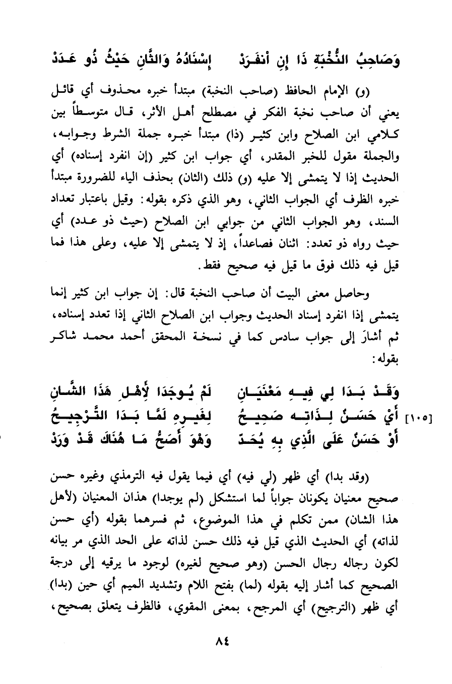 وحاصل معنى البيت أن صاحب النخبة قال: إن جواب ابن كثير إنما يتمشى إذا انفرد إسناد الحديث وجواب ابن الصلاح الثاني إذا تعدد إسناده، ثم أشارَ إلى جواب سادس كما في نسخة المحقق أحمد محمد شاكر بقوله:
