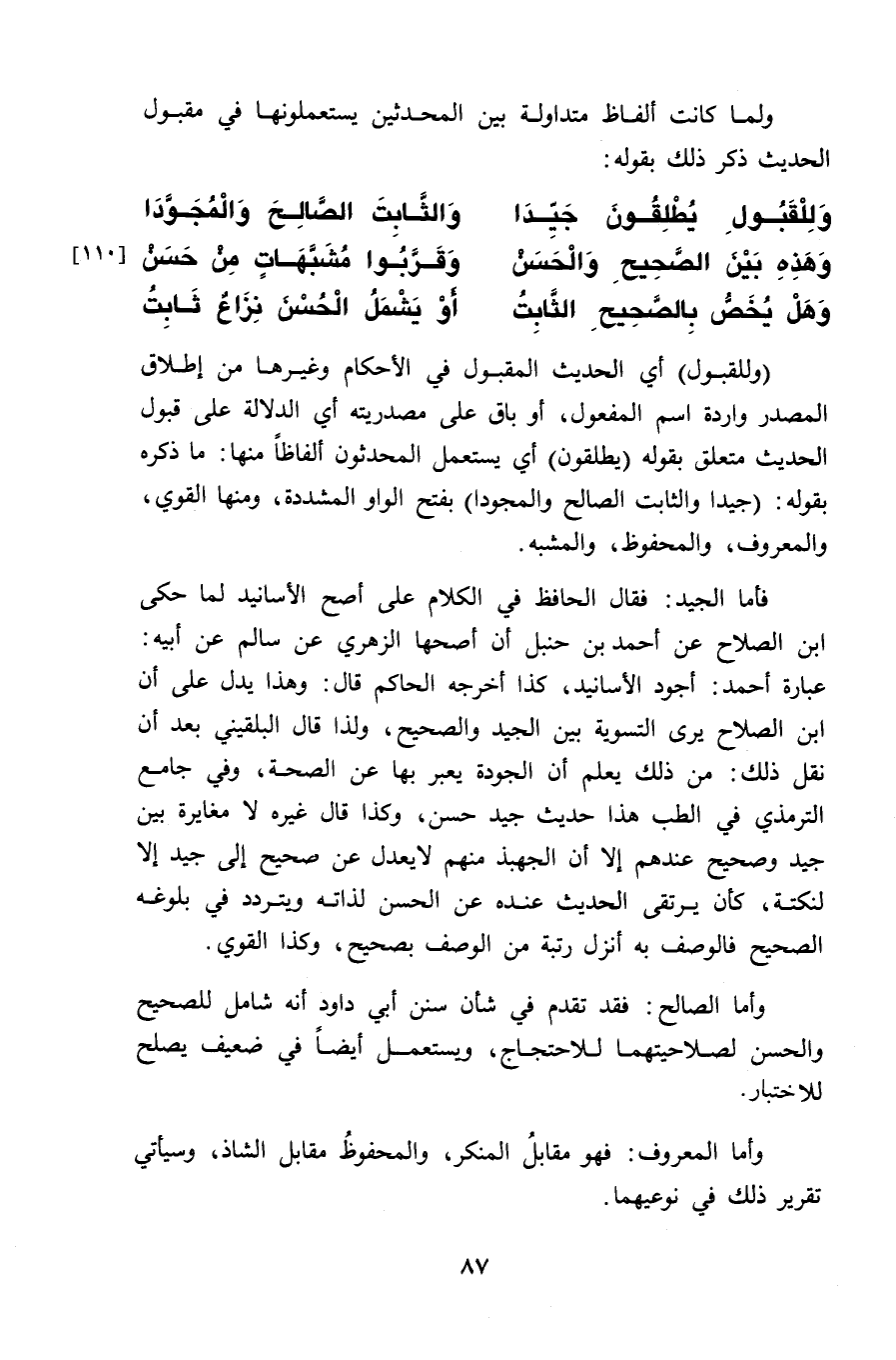 (وللقبول) أي الحديث المقبول في الأحكام وغيرها من إطلاق المصدر واردة اسم المفعول، أو باق على مصدريته أي الدلالة على قبول الحديث متعلق بقوله (يطلقون) أي يستعمل المحدثون ألفاظاً منها: ما ذكره بقوله: (جيدا والثابت الصالح والمجودا) بفتح الواو المشددة، ومنها القوي، والمعروف، والمحفوظ، والمشبه.
