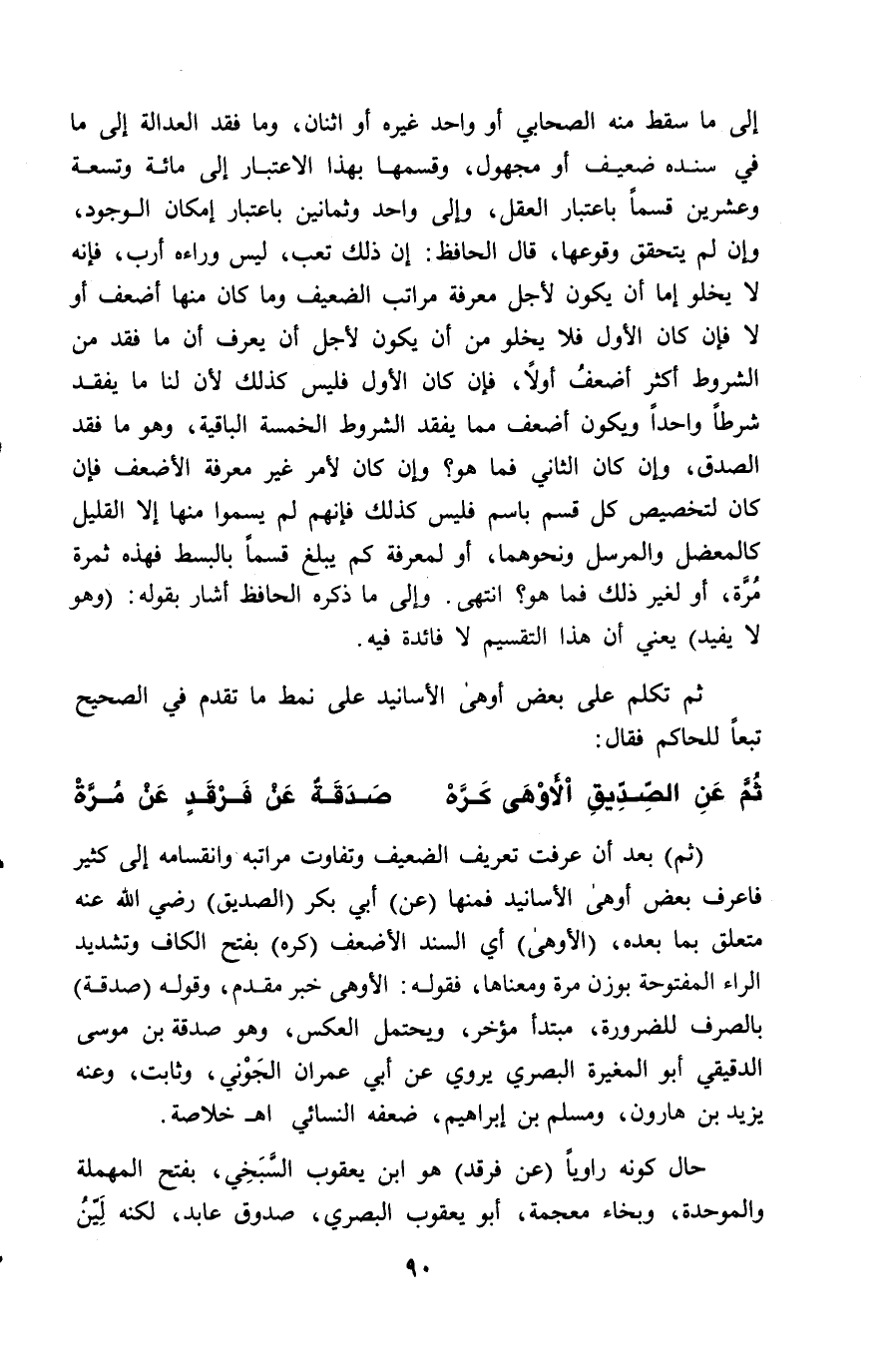 (ثم) بعد أن عرفت تعريف الضَّعِيف وتفاوت مراتبه وانقسامه إلى كثير فاعرف بعض أوهى الأسانيد فمنها (عن) أبي بكر (الصديق) - رضي الله عنه - متعلق بما بعده، (الأوهى) أي السَّند الأضعف (كره) بفتح الكاف وتشديد الراء المفتوحة بوزن مرة ومعناها، فقوله: الأوهى خبر مقدم، وقوله (صدقة) بالصرف للضرورة، مبتدأ مؤخر، ويحتمل العكس، وهو صدقة بن موسى الدقيقي أبو المغيرة البصري يروي عن أبي عمران الجَوْني، وثابت، وعنه يزيد بن هارون، ومسلم بن إبراهيم، ضعفه النسائي. اهـ خلاصة.