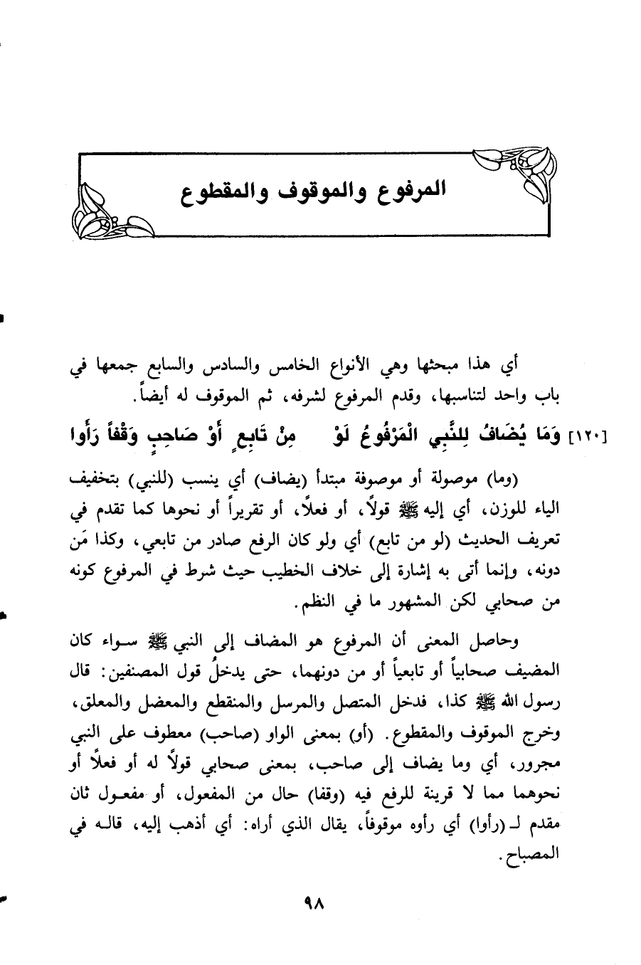 وحاصل المعنى أن المرفوع هو المضاف إلى النبي - صلى الله عليه وسلم - سواء كان المضيف صحابياً أو تابعياً أو من دونهما، حتى يدخلُ قول المصنفين: قال رسول الله - صلى الله عليه وسلم - كذا، فدخل المتصل والمرسل والمنقطع والمعضل والمعلق، وخرج الموقوف والمقطوع. (أو) بمعنى الواو (صاحب) معطوف على النبي مجرور، أي وما يضاف إلى صاحب، بمعنى صحابي قولاً له أو فعلاً أو نحوهما مما لا قرينة للرفع فيه (وقفا) حال من المفعول، أو مفعول ثان مقدم لـ (رأوا) أي رأوه موقوفاً، يقال الذي أراه: أي أذهب إليه، قاله في المصباح.