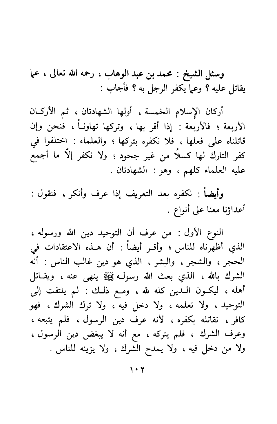 وسئل الشيخ: محمد بن عبد الوهاب، رحمه الله تعالى، عما يقاتل عليه؟ وعما يكفر الرجل به؟ فأجاب: