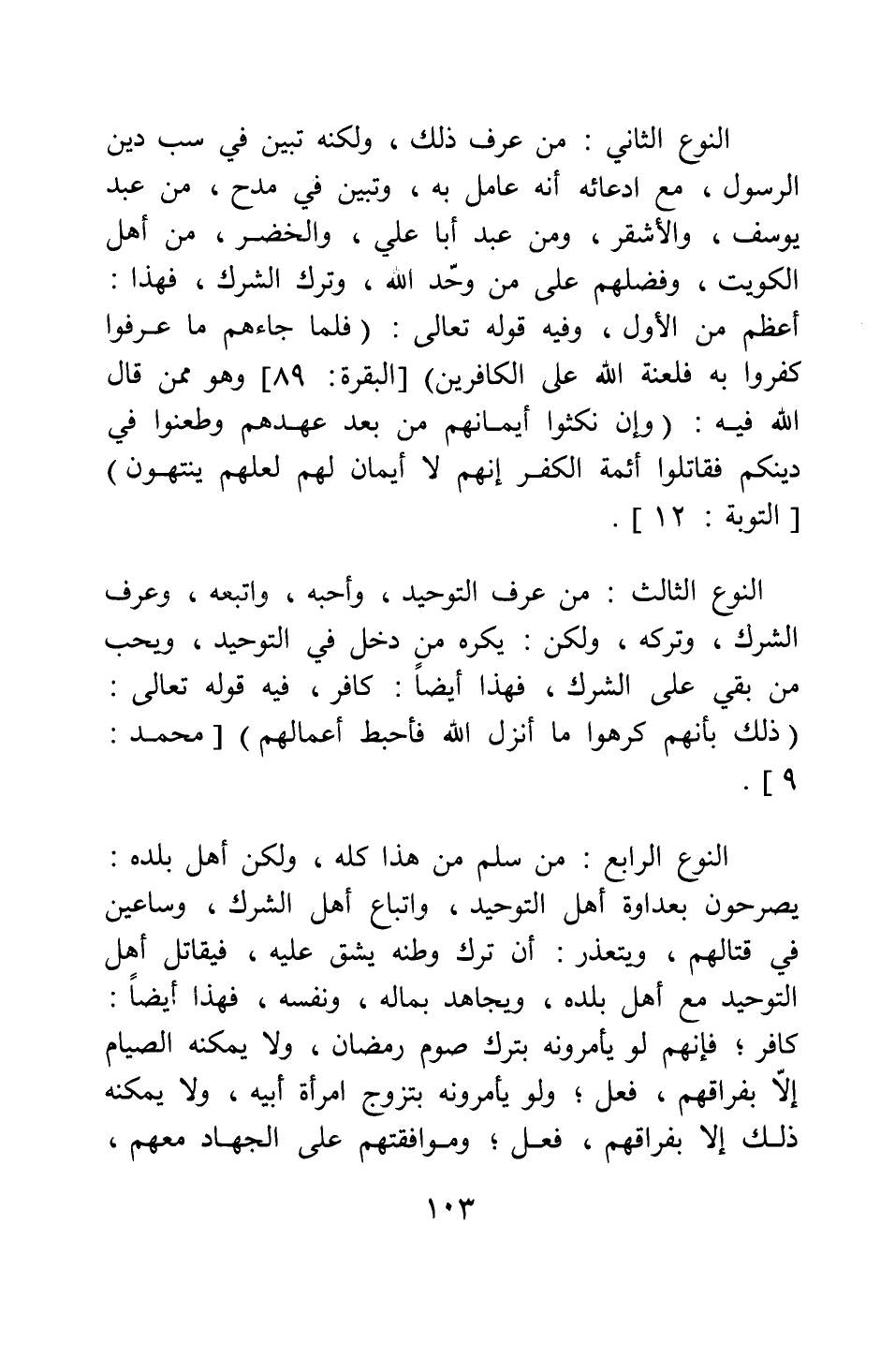 النوع الثالث: من عرف التوحيد، وأحبه، واتبعه، وعرف الشرك، وتركه، ولكن يكره من دخل في التوحيد، ويحب من بقي على الشرك، فهذا أيضا: كافر، فيه قوله تعالى: {ذَلِكَ بِأَنَّهُمْ كَرِهُوا مَا أَنْزَلَ اللَّهُ فَأَحْبَطَ أَعْمَالَهُمْ} [سورة محمد آية: 9] .