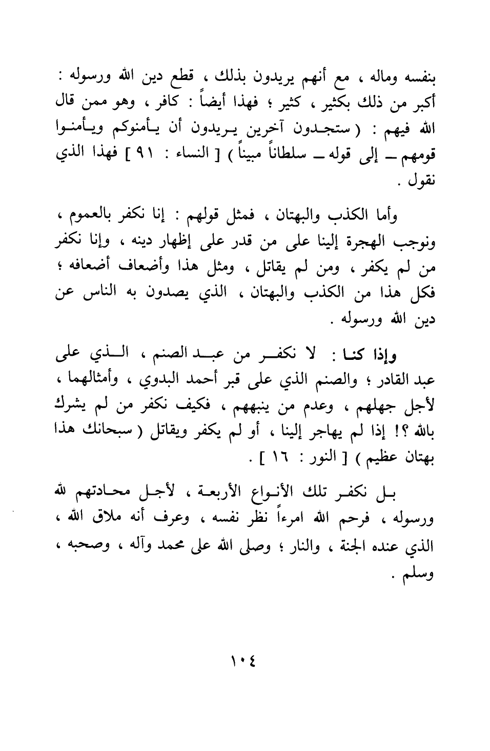 وإذا كنا لا نكفر من عبد الصنم، الذي على عبد القادر، والصنم الذي على قبر أحمد البدوي، وأمثالهما، لأجل جهلهم، وعدم من ينبههم، فكيف نكفر من لم يشرك بالله إذا لم يهاجر إلينا، أو لم يكفر ويقاتل؟: {سُبْحَانَكَ هَذَا بُهْتَانٌ عَظِيمٌ} [سورة النور آية: 16] .
