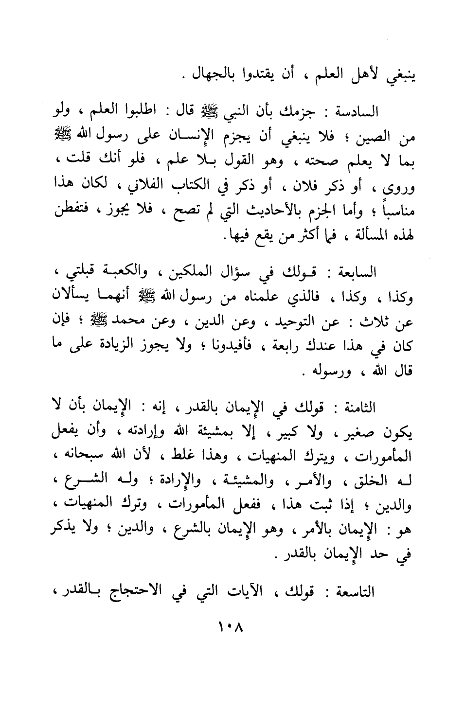 الثامنة: قولك في الإيمان بالقدر: إنه الإيمان بأن لا يكون صغير، ولا كبير، إلا بمشيئة الله وإرادته، وأن يفعل المأمورات، ويترك المنهيات؛ وهذا غلط، لأن الله سبحانه، له الخلق، والأمر، والمشيئة، والإرادة ; وله الشرع، والدين؛ إذا ثبت هذا، ففعل المأمورات، وترك المنهيات، هو: الإيمان بالأمر، وهو الإيمان بالشرع، والدين، ولا يذكر في حد الإيمان بالقدر.