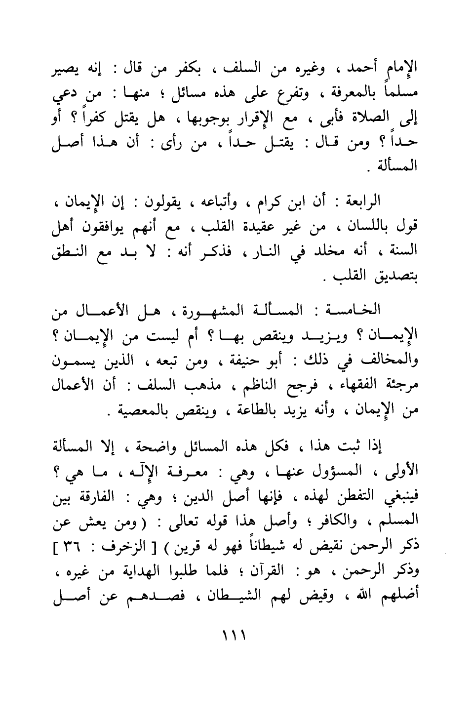 إذا ثبت هذا، فكل هذه المسائل واضحة، إلا المسألة الأولى، المسؤول عنها، وهي: معرفة الإله، ما هي؟ فينبغي التفطن لهذه، فإنها أصل الدين، وهي الفارقة بين المسلم، والكافر. وأصل هذا قوله تعالى: {وَمَنْ يَعْشُ عَنْ ذِكْرِ الرَّحْمَنِ نُقَيِّضْ لَهُ شَيْطَاناً فَهُوَ لَهُ قَرِينٌ} [سورة الزّخرف آية: 36] ، وذكر الرحمن، هو: القرآن، فلما طلبوا الهداية من غيره، أضلهم الله، وقيض لهم الشيطان، فصدهم عن أصل