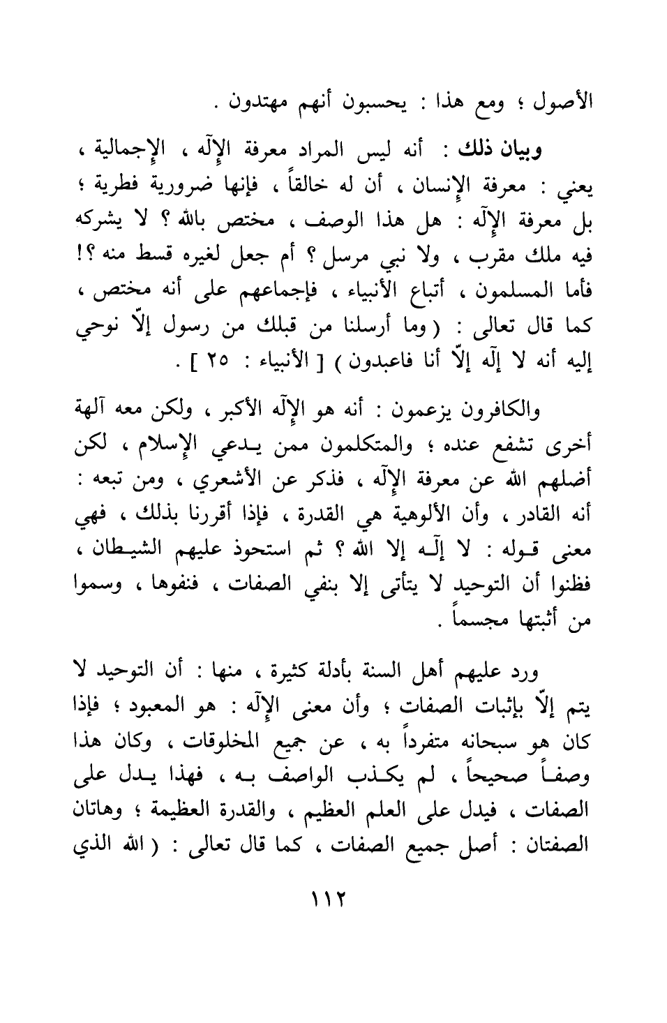 وبيان ذلك: أنه ليس المراد معرفة الإله الإجمالية يعني: معرفة الإنسان، أن له خالقا، فإنها ضرورية فطرية، بل معرفة الإله: هل هذا الوصف، مختص بالله؟ لا يشركه فيه ملك مقرب، ولا نبي مرسل؟ أم جعل لغيره قسط منه؟! فأما المسلمون، أتباع الأنبياء، فإجماعهم على أنه مختص، كما قال تعالى: {وَمَا أَرْسَلْنَا مِنْ قَبْلِكَ مِنْ رَسُولٍ إِلاَّ نُوحِي إِلَيْهِ أَنَّهُ لا إِلَهَ إِلاَّ أَنَا فَاعْبُدُونِ} [سورة الأنبياء آية: 25] .