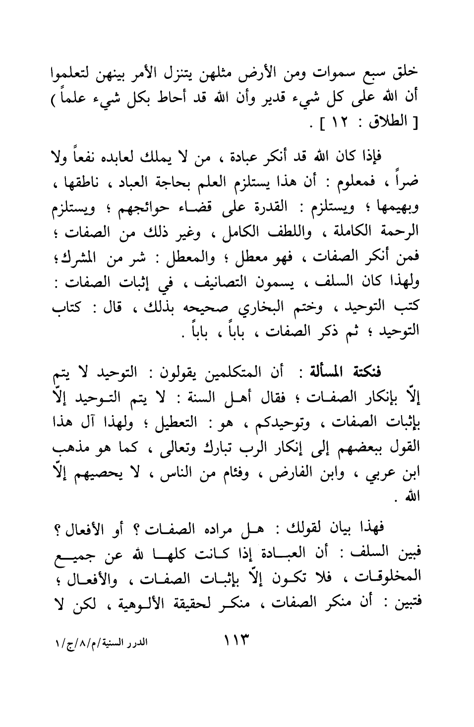 فإذا كان الله قد أنكر عبادة من لا يملك لعابده نفعا ولا ضرا، فمعلوم أن هذا يستلزم العلم بحاجة العباد، ناطقها، وبهيمها ; وتستلزم القدرة على قضاء حوائجهم، ويستلزم الرحمة الكاملة، واللطف الكامل، وغير ذلك من الصفات ; فمن أنكر الصفات، فهو معطل، والمعطل شر من المشرك؛ ولهذا كان السلف، يسمون التصانيف، في إثبات الصفات: كتب التوحيد، وختم البخاري صحيحه بذلك، قال: كتاب التوحيد ; ثم ذكر الصفات، بابا، بابا.