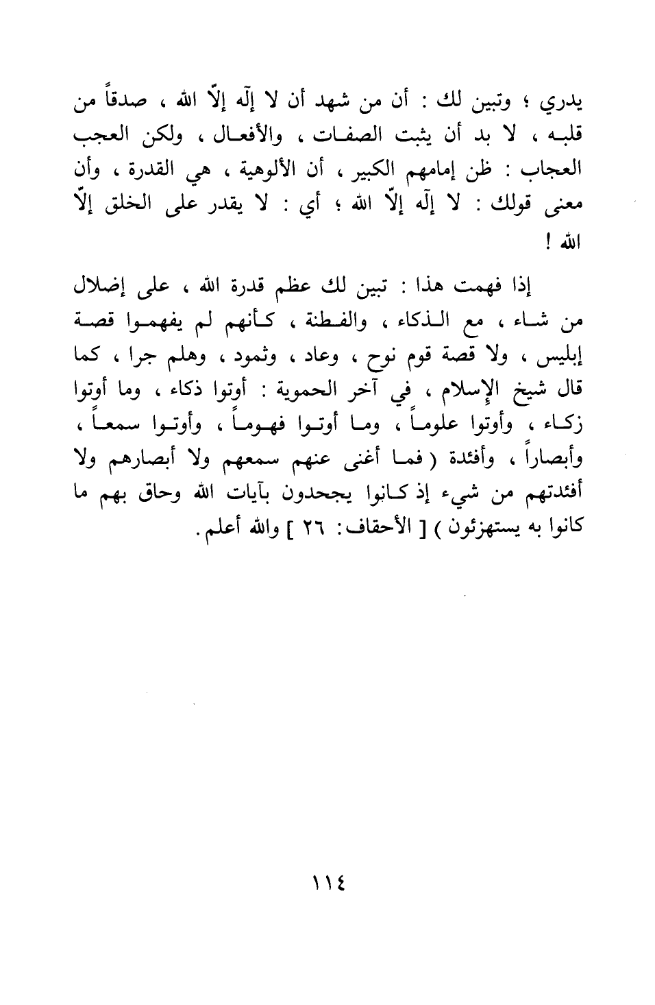 إذا فهمت هذا تبين لك عظم قدرة الله، على إضلال من شاء، مع الذكاء، والفطنة، كأنهم لم يفهموا قصة إبليس، ولا قصة قوم نوح، وعاد، وثمود، وهلم جرا، كما قال شيخ الإسلام، في آخر الحموية: أوتوا ذكاء، وما أوتوا زكاء، وأوتوا علوما، وما أوتوا فهوما، وأوتوا سمعا، وأبصارا، وأفئدة {فَمَا أَغْنَى عَنْهُمْ سَمْعُهُمْ وَلا أَبْصَارُهُمْ وَلا أَفْئِدَتُهُمْ مِنْ شَيْءٍ إِذْ كَانُوا يَجْحَدُونَ بِآياتِ اللَّهِ وَحَاقَ بِهِمْ مَا كَانُوا بِهِ يَسْتَهْزِئُونَ} [سورة الأحقاف آية: 26] . والله أعلم.