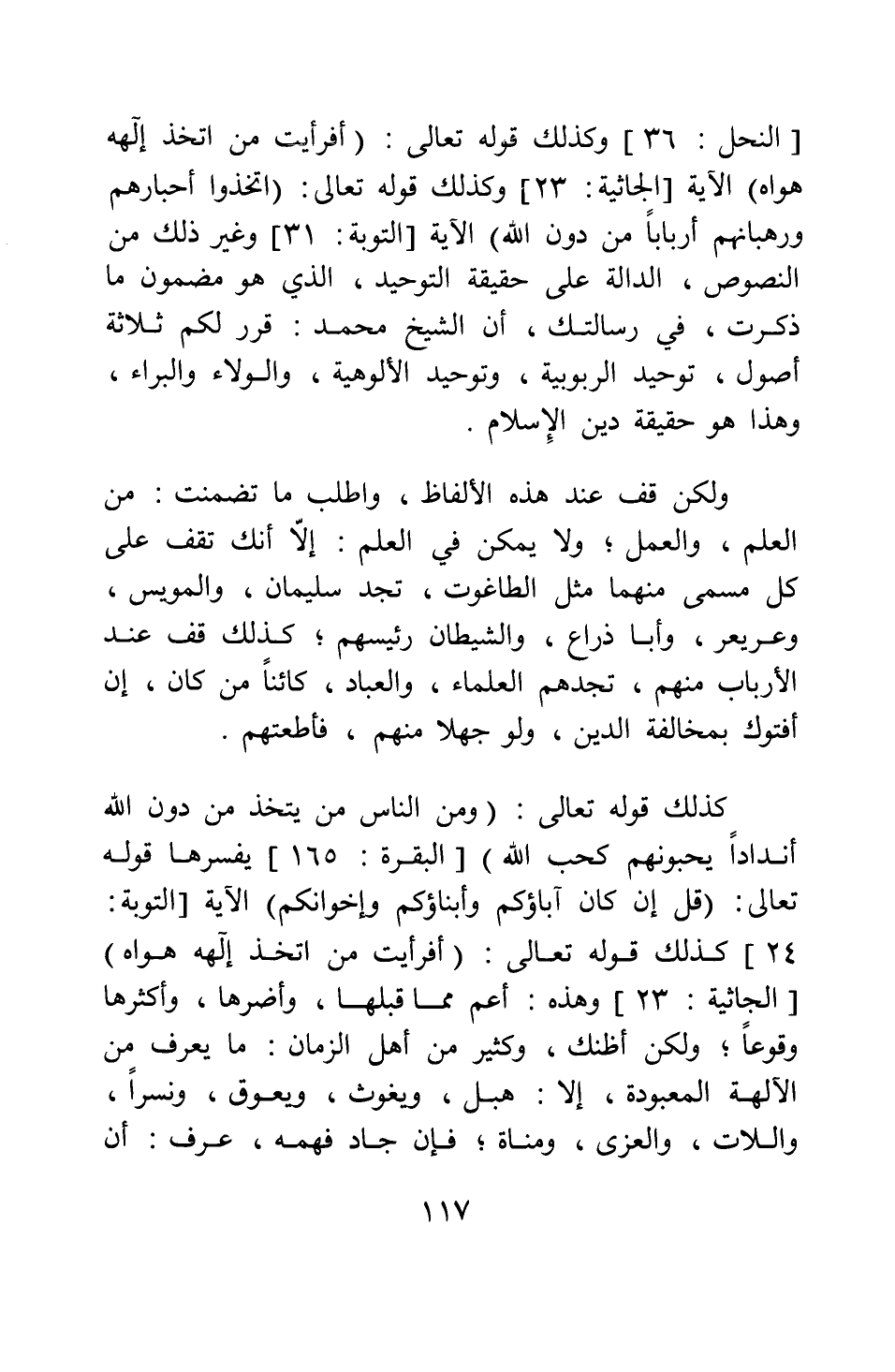 وكذلك قوله تعالى: {أَفَرَأَيْتَ مَنِ اتَّخَذَ إِلَهَهُ هَوَاهُ} الآية [سورة آية: 23] ، وكذلك قوله تعالى: {اتَّخَذُوا أَحْبَارَهُمْ وَرُهْبَانَهُمْ أَرْبَاباً مِنْ دُونِ اللَّهِ} الآية [سورة التوبة آية: 31] ، وغير ذلك من النصوص، الدالة على حقيقة التّوحيد الذي هو مضمون ماذكرت في رسالتك أنّ محمد قرر لكم ثلاثة أصول: توحيد الربوبية، وتوحيد الألوهية، والولاء والبراء، وهذا هو حقيقة دين الإسلام.