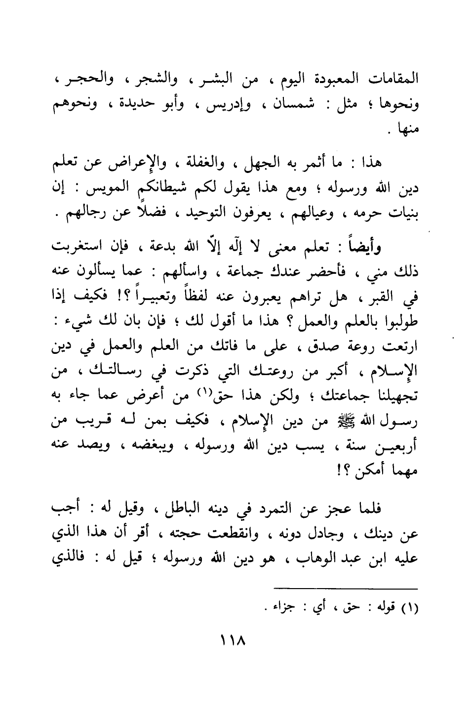 وأيضا تعلم معنى لا إله إلا الله بدعة، فإن استغربت ذلك مني، فأحضر عندك جماعة، واسألهم: عما يسألون عنه في القبر، هل تراهم يعبرون عنه لفظا وتعبيرا؟ ! فكيف إذا طولبوا بالعلم والعمل؟ هذا ما أقول لك، فإن بان لك شيء ارتعت روعة صدق، على ما فاتك من العلم والعمل في دين الإسلام، أكبر من روعتك التي ذكرت في رسالتك، من تجهيلنا جماعتك ; ولكن هذا حق 1 من أعرض عما جاء به رسول الله صلى الله عليه وسلم من دين الإسلام، فكيف بمن له قريب من أربعين سنة، يسب دين الله ورسوله، ويبغضه، ويصد عنه مهما أمكن؟!