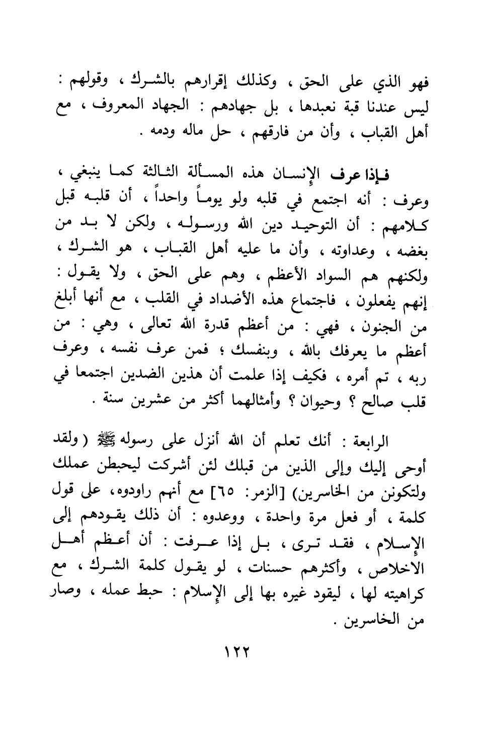 فإذا عرف الإنسان هذه المسألة الثالثة كما ينبغي، وعرف أنه اجتمع في قلبه ولو يوما واحدا، أن قلبه قبل كلامهم أن التوحيد دين الله ورسوله، ولكن لا بد من بغضه وعداوته، وأن ما عليه أهل القباب هو الشرك، ولكنهم هم السواد الأعظم، وهم على الحق، ولا يقول: إنهم يفعلون، فاجتماع هذه الأضداد في القلب، مع أنها أبلغ من الجنون، فهي من أعظم قدرة الله تعالى، وهي من أعظم ما يعرفك بالله، وبنفسك، فمن عرف نفسه، وعرف ربه، تم أمره، فكيف إذا علمت أن هذين الضدين اجتمعا في قلب صالح وحيوان وأمثالهما أكثر من عشرين سنة؟.