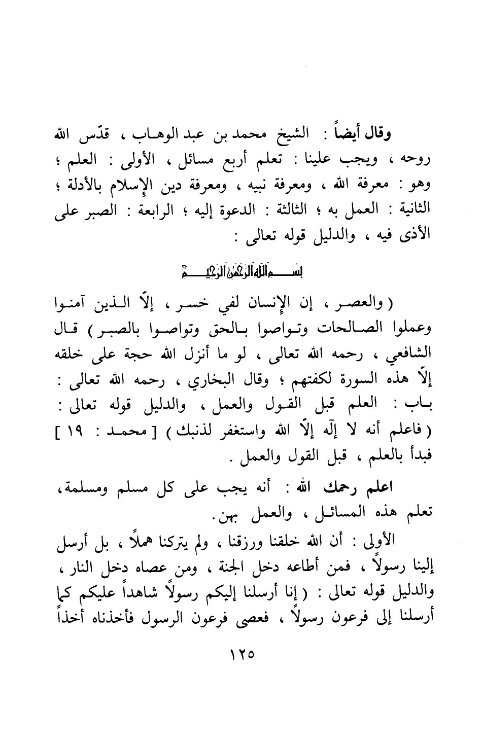وقال أيضا الشيخ محمد بن عبد الوهاب، قدس الله روحه: ويجب علينا تعلم أربع مسائل: