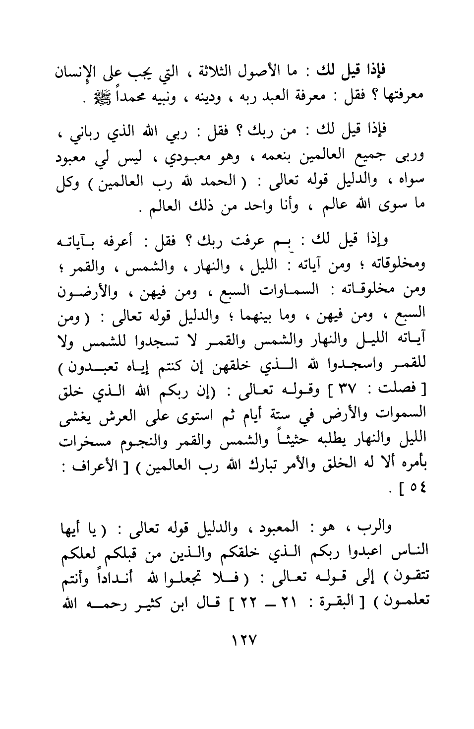 فإذا قيل لك: ما الأصول الثلاثة، التي يجب على الإنسان معرفتها؟ فقل: معرفة العبد ربه، ودينه، ونبيه محمدا صلى الله عليه وسلم.