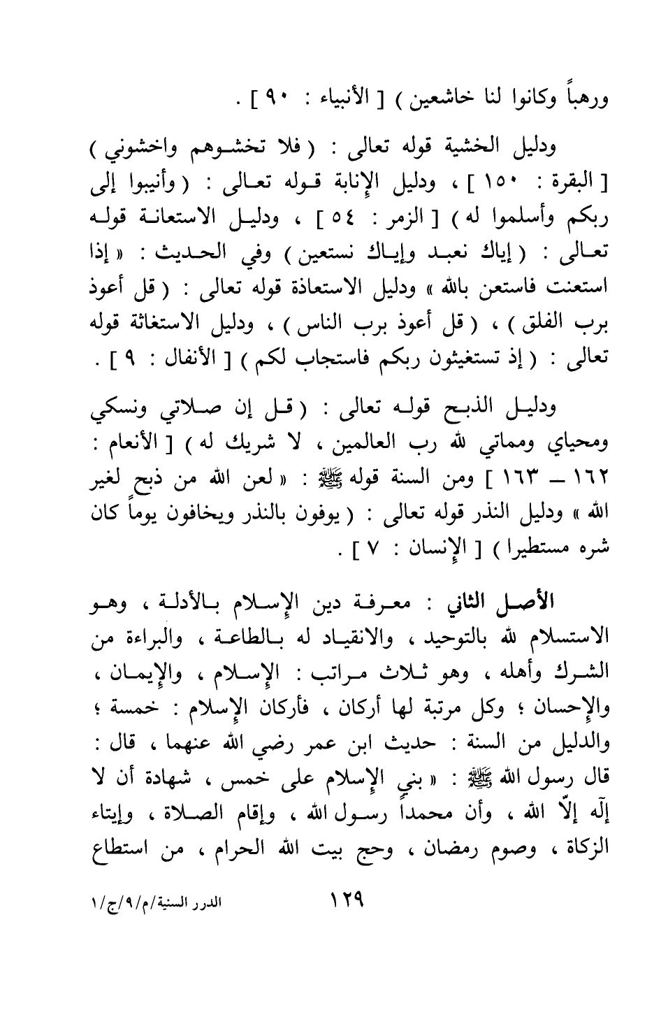 الأصل الثاني: معرفة دين الإسلام بالأدلة، وهو الاستسلام لله بالتوحيد، والانقياد له بالطاعة، والبراءة من الشرك وأهله. وهو ثلاث مراتب: الإسلام، والإيمان، والإحسان. وكل مرتبة لها أركان. فأركان الإسلام: خمسة، والدليل من السنة: حديث ابن عمر رضي الله عنهما، قال: قال رسول الله صلى الله عليه وسلم: " بني الإسلام على خمس، شهادة أن لا إله إلا الله، وأن محمدا رسول الله، وإقام الصلاة، وإيتاء الزكاة، وصوم رمضان، وحج بيت الله الحرام من استطاع
