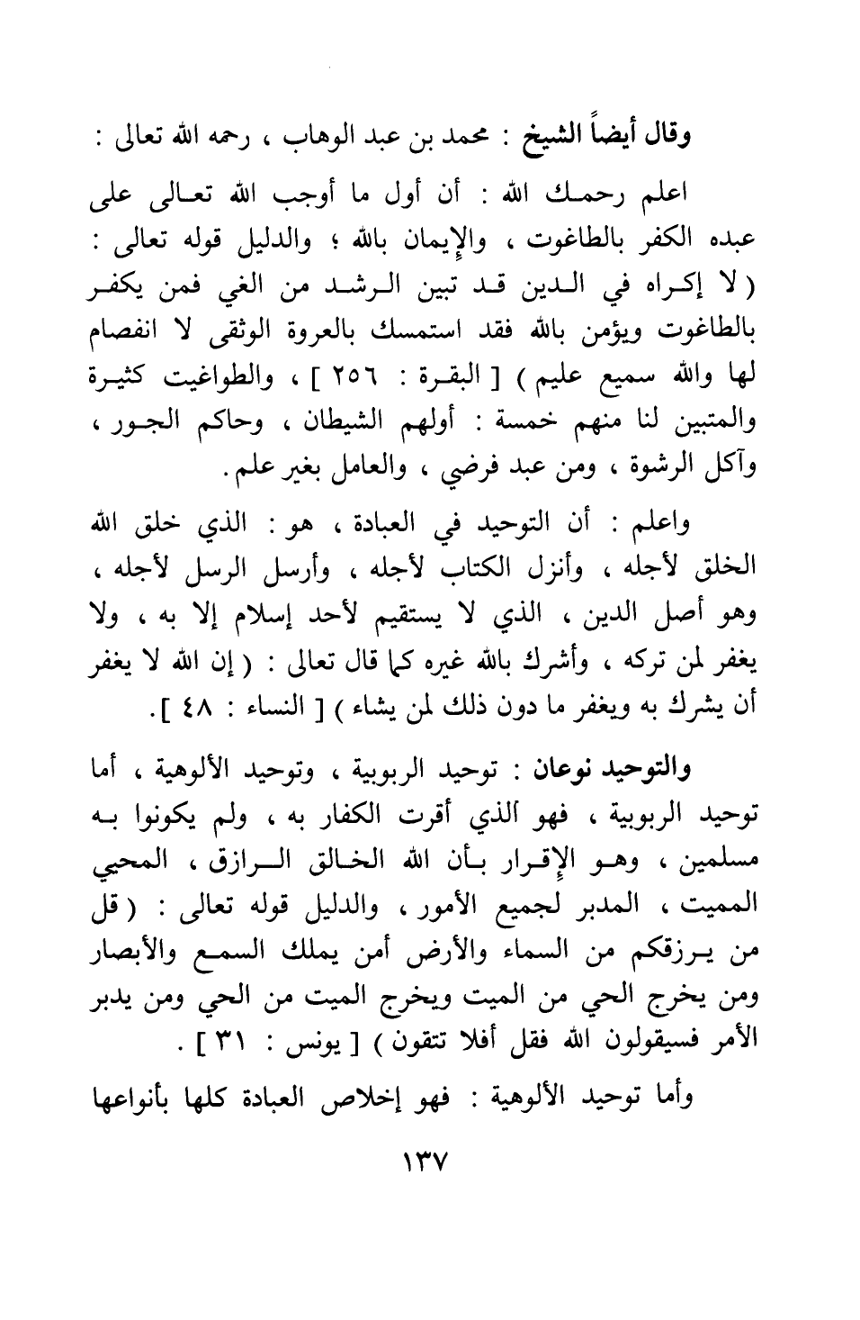 الشيخ: محمد بن عبد الوهاب، رحمه الله تعالى: اعلم رحمك الله أن أول ما أوجب الله تعالى على عبده الكفر بالطاغوت والإيمان بالله، والدليل قوله تعالى: {لا إِكْرَاهَ فِي الدِّينِ قَدْ تَبَيَّنَ الرُّشْدُ مِنَ الْغَيِّ فَمَنْ يَكْفُرْ بِالطَّاغُوتِ وَيُؤْمِنْ بِاللَّهِ فَقَدِ اسْتَمْسَكَ بِالْعُرْوَةِ الْوُثْقَى لا انْفِصَامَ لَهَا وَاللَّهُ سَمِيعٌ عَلِيمٌ} ، [البقرة: 256] . والطواغيت كثيرة والمتبين لنا منهم خمسة: أولهم الشيطان، وحاكم الجور، وآكل الرشوة، ومن عُبد فرضي، والعامل بغير علم.