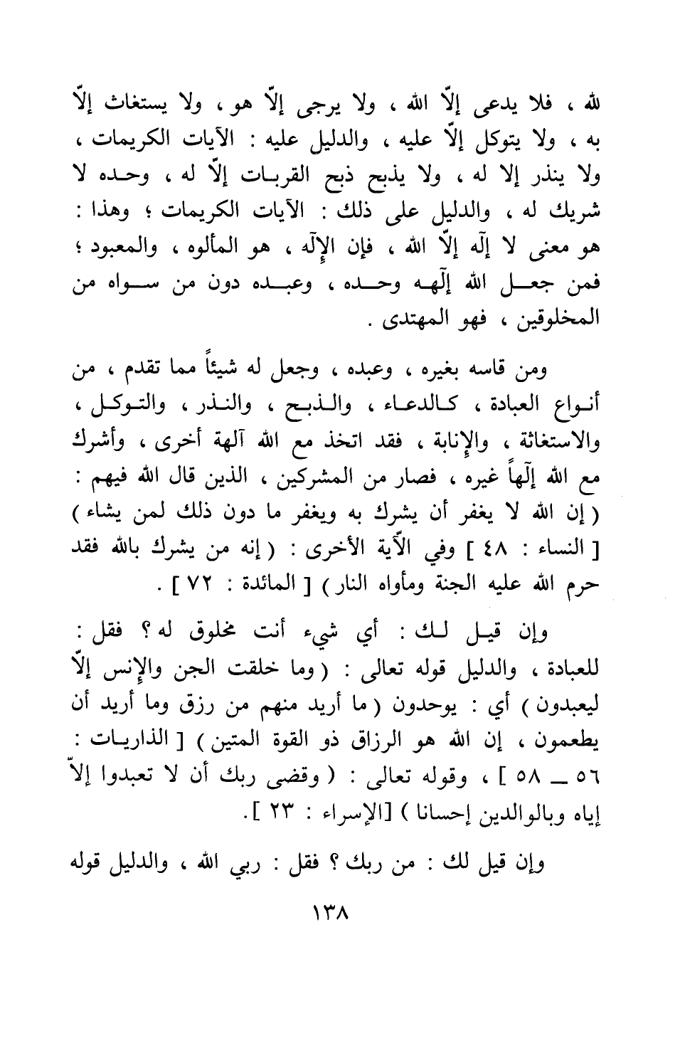 لله؛ فلا يدعى إلا الله، ولا يرجى إلا هو، ولا يستغاث إلا به، ولا يتوكل إلا عليه، والدليل عليه: الآيات الكريمات، ولا ينذر إلا له، ولا يذبح ذبح القربات إلا له وحده لا شريك له، والدليل على ذلك: الآيات الكريمات. وهذا: هو معنى لا إله إلا الله، فإن الإله هو المألوه، والمعبود، فمن جعل الله إلهه وحده، وعبده دون من سواه من المخلوقين، فهو المهتدي.