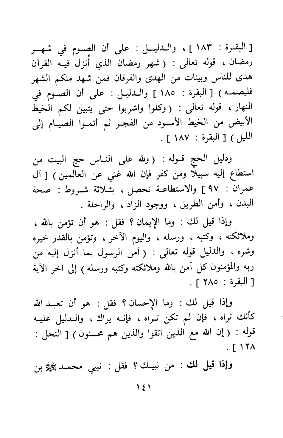 وإذا قيل لك: وما الإيمان؟ فقل: هو أن تؤمن بالله، وملائكته، وكتبه، ورسله، واليوم الآخر، وتؤمن بالقدر خيره وشره، والدليل قوله تعالى: {آمَنَ الرَّسُولُ بِمَا أُنْزِلَ إِلَيْهِ مِنْ رَبِّهِ وَالْمُؤْمِنُونَ كُلٌّ آمَنَ بِاللَّهِ وَمَلائِكَتِهِ وَكُتُبِهِ وَرُسُلِهِ} إلى آخر الآية [سورة البقرة آية: 285] .