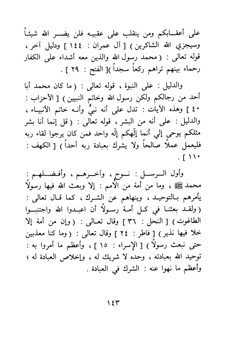 والدليل على النبوة، قوله تعالى: {مَا كَانَ مُحَمَّدٌ أَبَا أَحَدٍ مِنْ رِجَالِكُمْ وَلَكِنْ رَسُولَ اللَّهِ وَخَاتَمَ النَّبِيِّينَ} ، [الأحزاب، من الآية: 40] . وهذه الآيات: تدل على أنه نبي، وأنه خاتم الأنبياء. والدليل: على أنه من البشر، قوله تعالى: {قُلْ إِنَّمَا أَنَا بَشَرٌ مِثْلُكُمْ يُوحَى إِلَيَّ أَنَّمَا إِلَهُكُمْ إِلَهٌ وَاحِدٌ فَمَنْ كَانَ يَرْجُوا لِقَاءَ رَبِّهِ فَلْيَعْمَلْ عَمَلاً صَالِحاً وَلا يُشْرِكْ بِعِبَادَةِ رَبِّهِ أَحَداً} ، [الكهف: 110] .