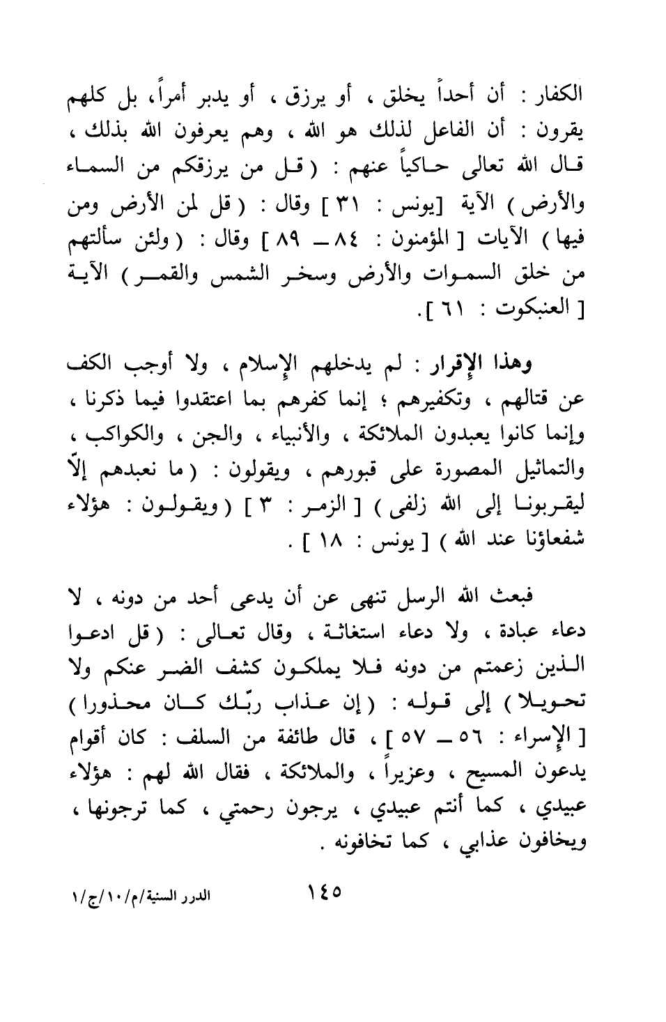 وهذا الإقرار لم يدخلهم الإسلام، ولا أوجب الكف عن قتالهم وتكفيرهم؛ إنما كفرهم بما اعتقدوا فيما ذكرنا، وإنما كانوا يعبدون الملائكة، والأنبياء، والجن، والكواكب، والتماثيل المصورة على قبورهم، ويقولون: {مَا نَعْبُدُهُمْ إِلاَّ لِيُقَرِّبُونَا إِلَى اللَّهِ زُلْفَى} ، [سورة الزمر آية: 3] ، و {وَيَقُولُونَ هَؤُلاءِ شُفَعَاؤُنَا عِنْدَ اللَّهِ} [سورة يونس آية: 18] .