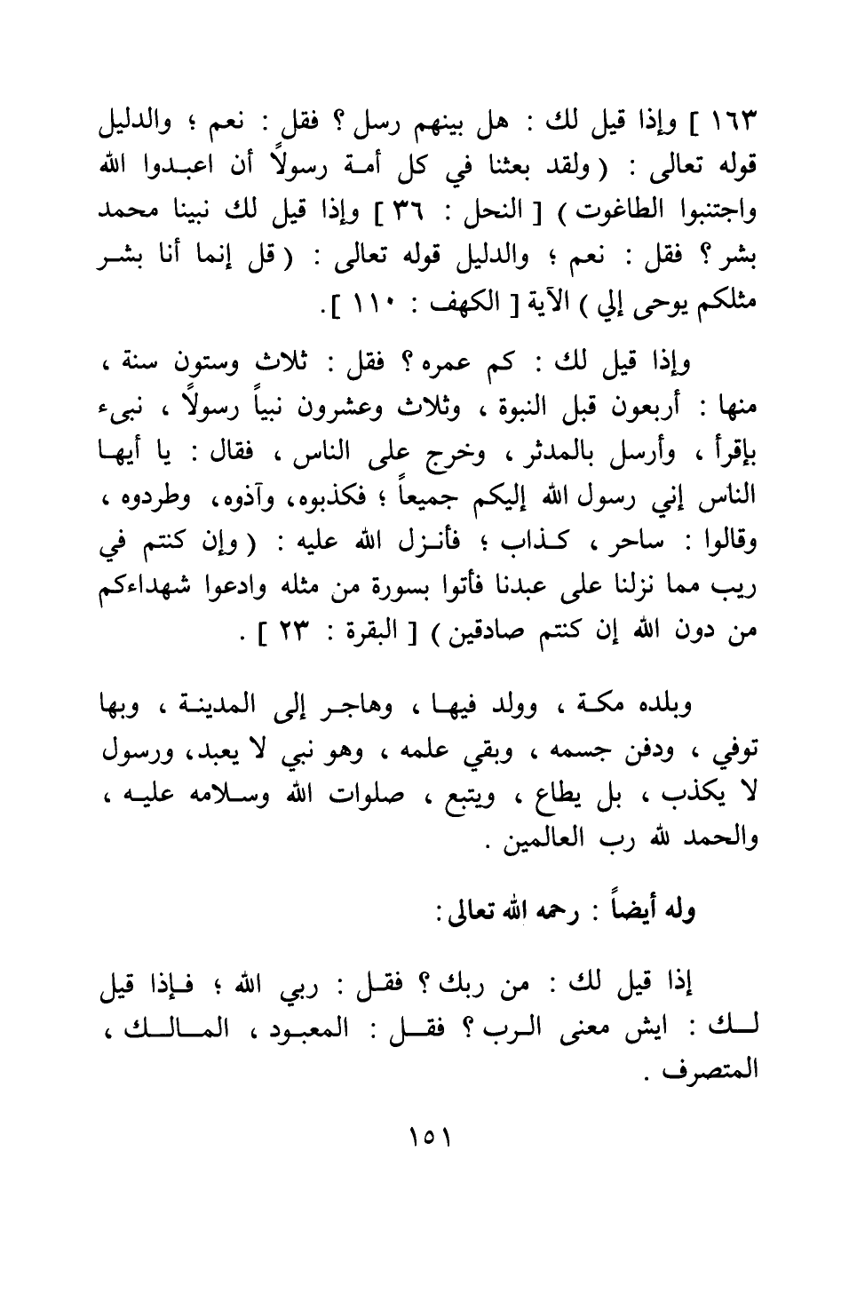 وإذا قيل لك: هل بينهم رسل؟ فقل: نعم. والدليل قوله تعالى: {وَلَقَدْ بَعَثْنَا فِي كُلِّ أُمَّةٍ رَسُولاً أَنِ اعْبُدُوا اللَّهَ وَاجْتَنِبُوا} [سورة النحل آية: 36] . وإذا قيل لك: نبينا محمد بشر؟ فقل: نعم، والدليل قوله تعالى: {قُلْ إِنَّمَا أَنَا بَشَرٌ مِثْلُكُمْ يُوحَى إِلَيَّ} الآية [سورة الكهف آية: 110] .