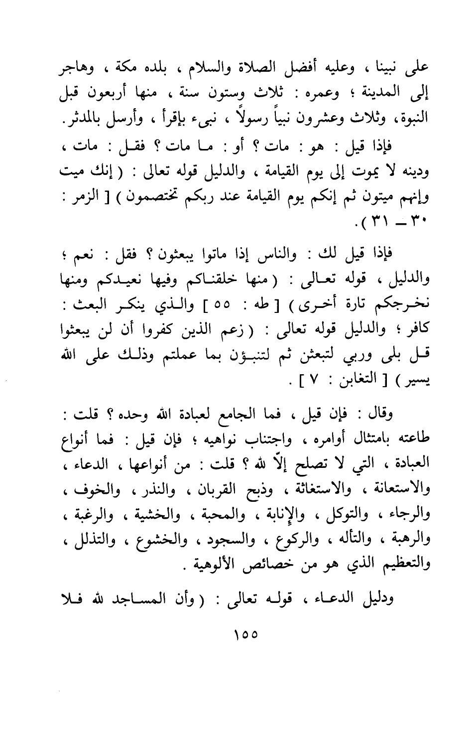 على نبينا وعليه أفضل الصلاة والسلام. بلده مكة، وهاجر إلى المدينة، وعمره ثلاث وستون سنة، منها أربعون قبل النبوة، وثلاث وعشرون نبيا رسولا، نبئ باقرأ، وأرسل بالمدثر.