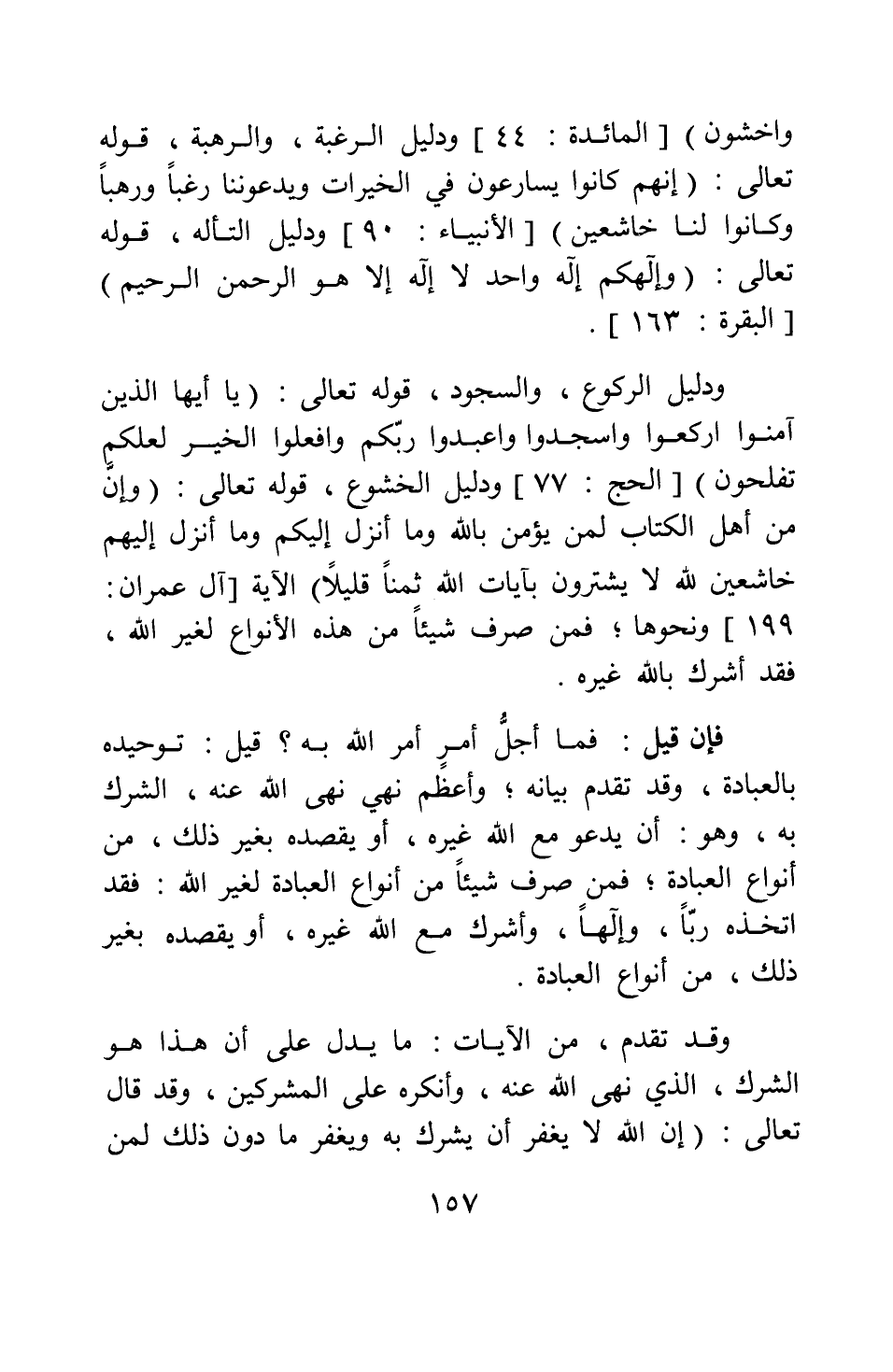 ودليل الركوع والسجود قوله تعالى: {يَا أَيُّهَا الَّذِينَ آمَنُوا ارْكَعُوا وَاسْجُدُوا وَاعْبُدُوا رَبَّكُمْ وَافْعَلُوا الْخَيْرَ لَعَلَّكُمْ تُفْلِحُونَ} [الحجّ: 77] . ودليل الخشوع قوله تعالى: {وَإِنَّ مِنْ أَهْلِ الْكِتَابِ لَمَنْ يُؤْمِنُ بِاللَّهِ وَمَا أُنْزِلَ إِلَيْكُمْ وَمَا أُنْزِلَ إِلَيْهِمْ خَاشِعِينَ لِلَّهِ لا يَشْتَرُونَ بِآيَاتِ اللَّهِ ثَمَناً قَلِيلاً} الآية [سورة آل عمران آية: 199] ، ونحوها. فمن صرف شيئا من هذه الأنواع لغير الله، فقد أشرك بالله غيره.