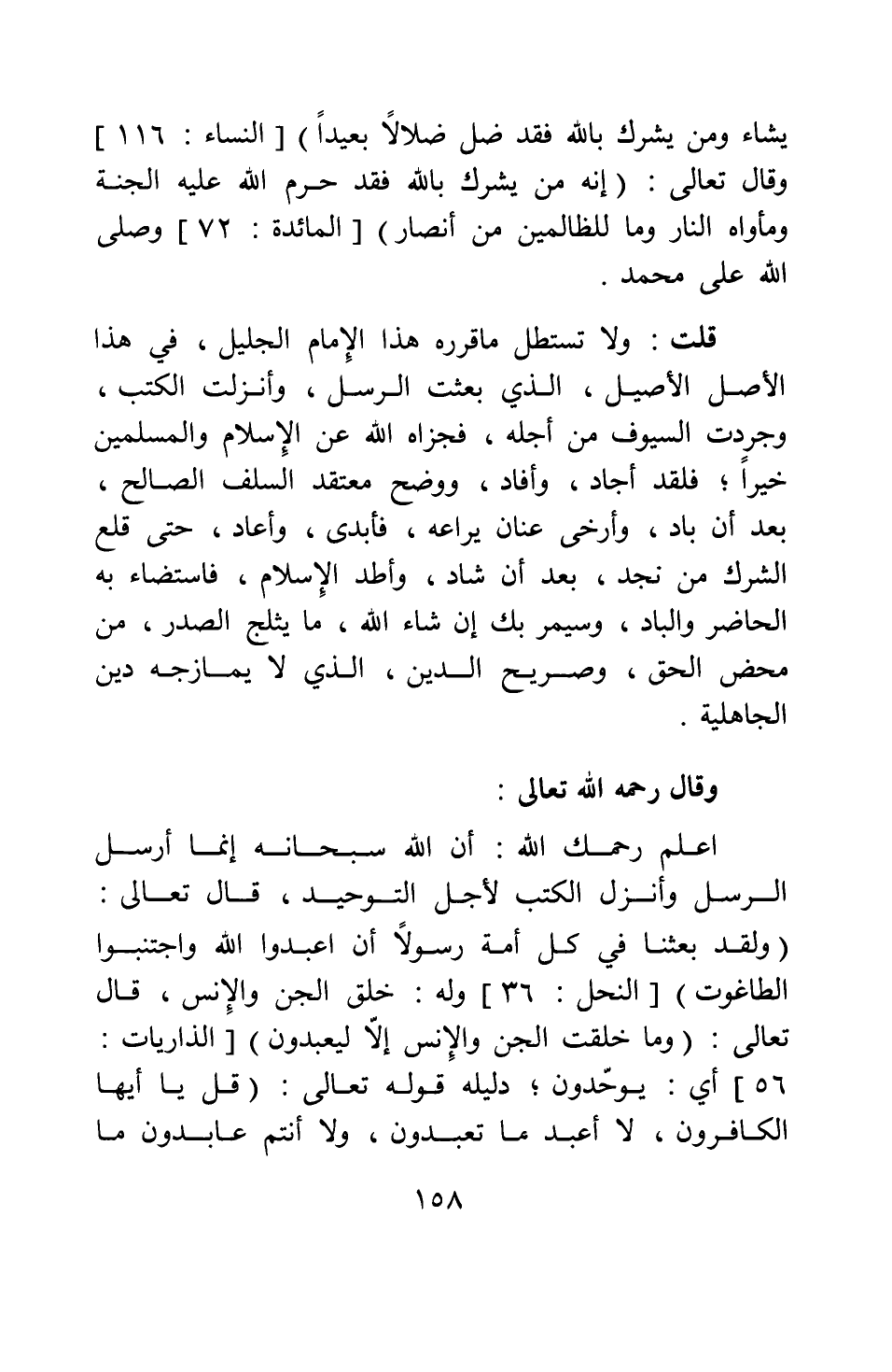 قلت: ولاتستطل ما قرره هذا الإمام الجليل، في هذا الأصل الأصيل، الذي بعثت الرسل، وأنزلت الكتب، وجردت السيوف من أجله، فجزاه الله عن الإسلام والمسلمين خيرا، فلقد أجاد وأفاد، ووضح معتقد السلف الصالح بعد أن باد، وأرخى عنان يراعه، فأبدى وأعاد، حتى قلع الشرك من نجد بعد أن شاد، وأطد الإسلام فاستضاء به الحاضر والباد، وسيمر بك - إن شاء الله - ما يثلج الصدر، من محض الحق، وصريح الدين، الذي لا يمازجه دين الجاهلية.