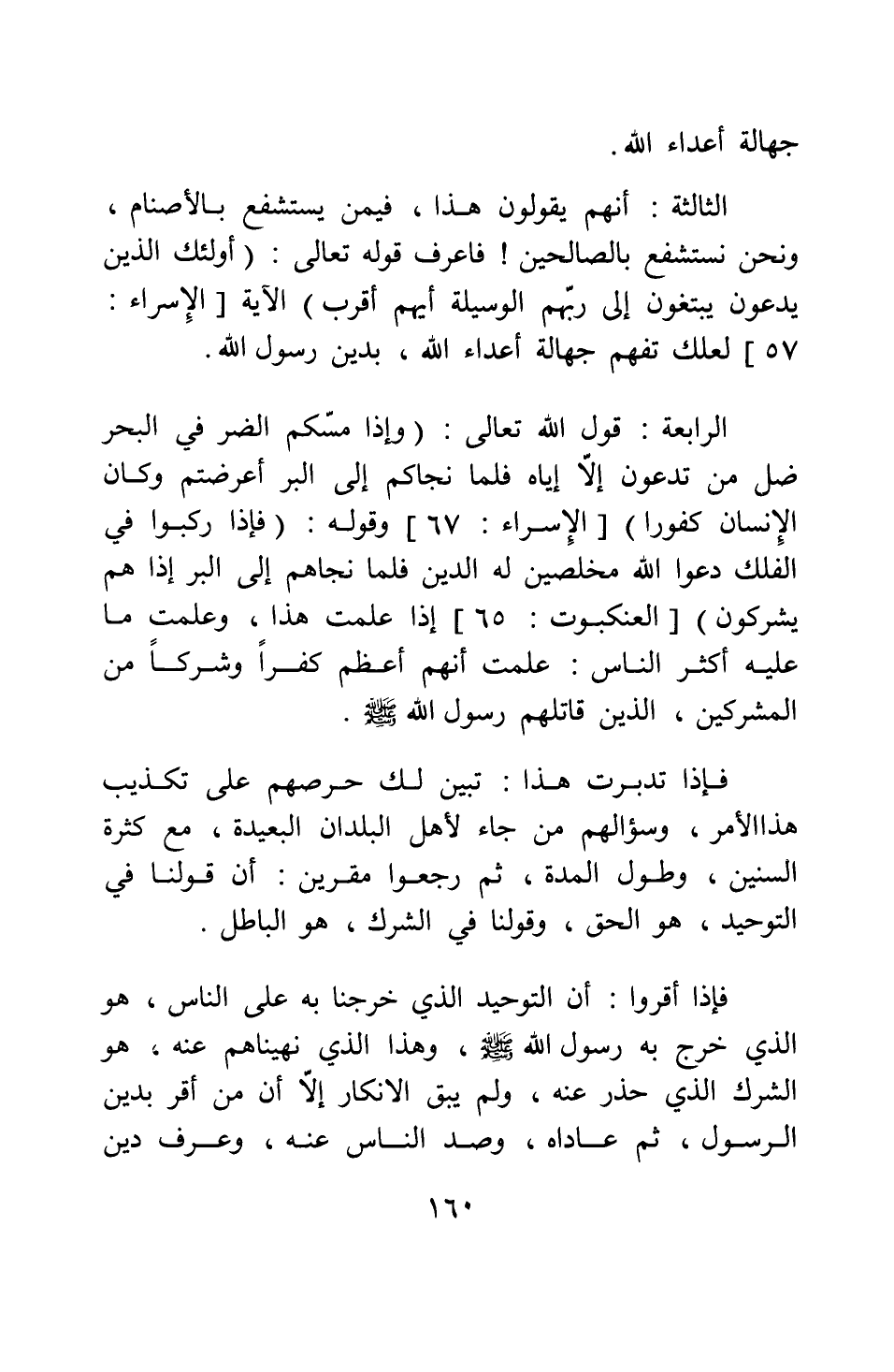 الرابعة: قول الله تعالى: {وَإِذَا مَسَّكُمُ الضُّرُّ فِي الْبَحْرِ ضَلَّ مَنْ تَدْعُونَ إِلاَّ إِيَّاهُ فَلَمَّا نَجَّاكُمْ إِلَى الْبَرِّ أَعْرَضْتُمْ وَكَانَ الأِنْسَانُ كَفُوراً} [الإسراء: 67] . وقوله: {فَإِذَا رَكِبُوا فِي الْفُلْكِ دَعَوُا اللَّهَ مُخْلِصِينَ لَهُ الدِّينَ فَلَمَّا نَجَّاهُمْ إِلَى الْبَرِّ إِذَا هُمْ يُشْرِكُونَ} [العنكبوت: 65] ؛ إذا علمت هذا، وعلمت ما عليه أكثر الناس: علمت أنهم أعظم كفرا وشركا من المشركين الذين قاتلهم رسول الله صلى الله عليه وسلم.