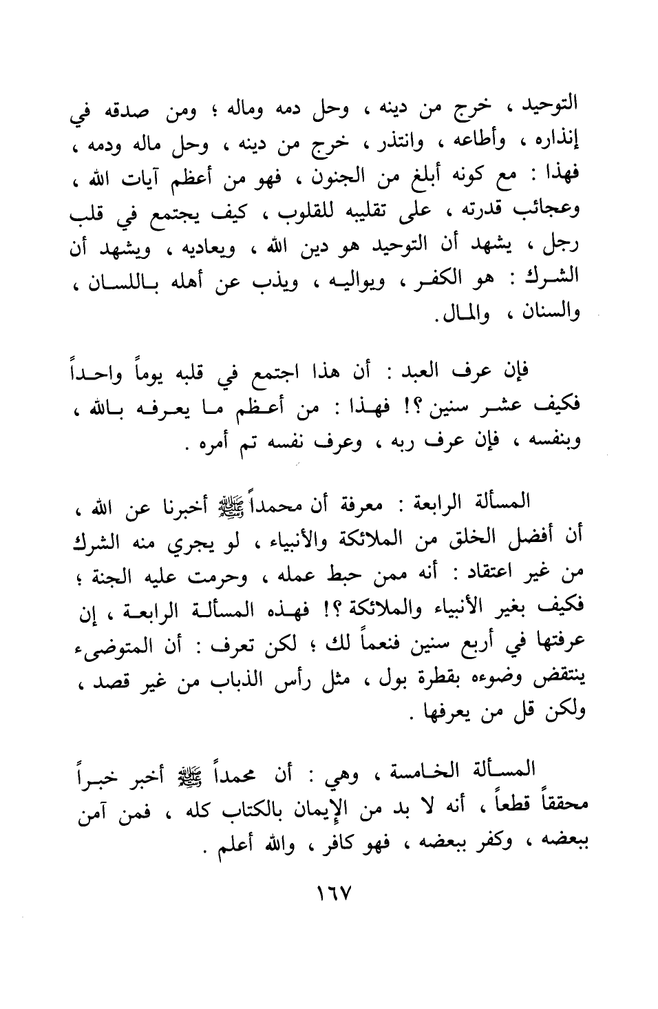 المسألة الرابعة: معرفة أن محمدا صلى الله عليه وسلم أخبرنا عن الله، أن أفضل الخلق من الملائكة والأنبياء، لو يجري منه الشرك من غير اعتقاد، أنه ممن حبط عمله، وحرمت عليه الجنة. فكيف بغير الأنبياء والملائكة؟ ! فهذه المسألة الرابعة، إن عرفتها في أربع سنين فنعما لك، لكن تعرف أن المتوضئ ينتقض وضوؤه بقطرة بول، مثل رأس الذباب من غير قصد، ولكن قل من يعرفها.