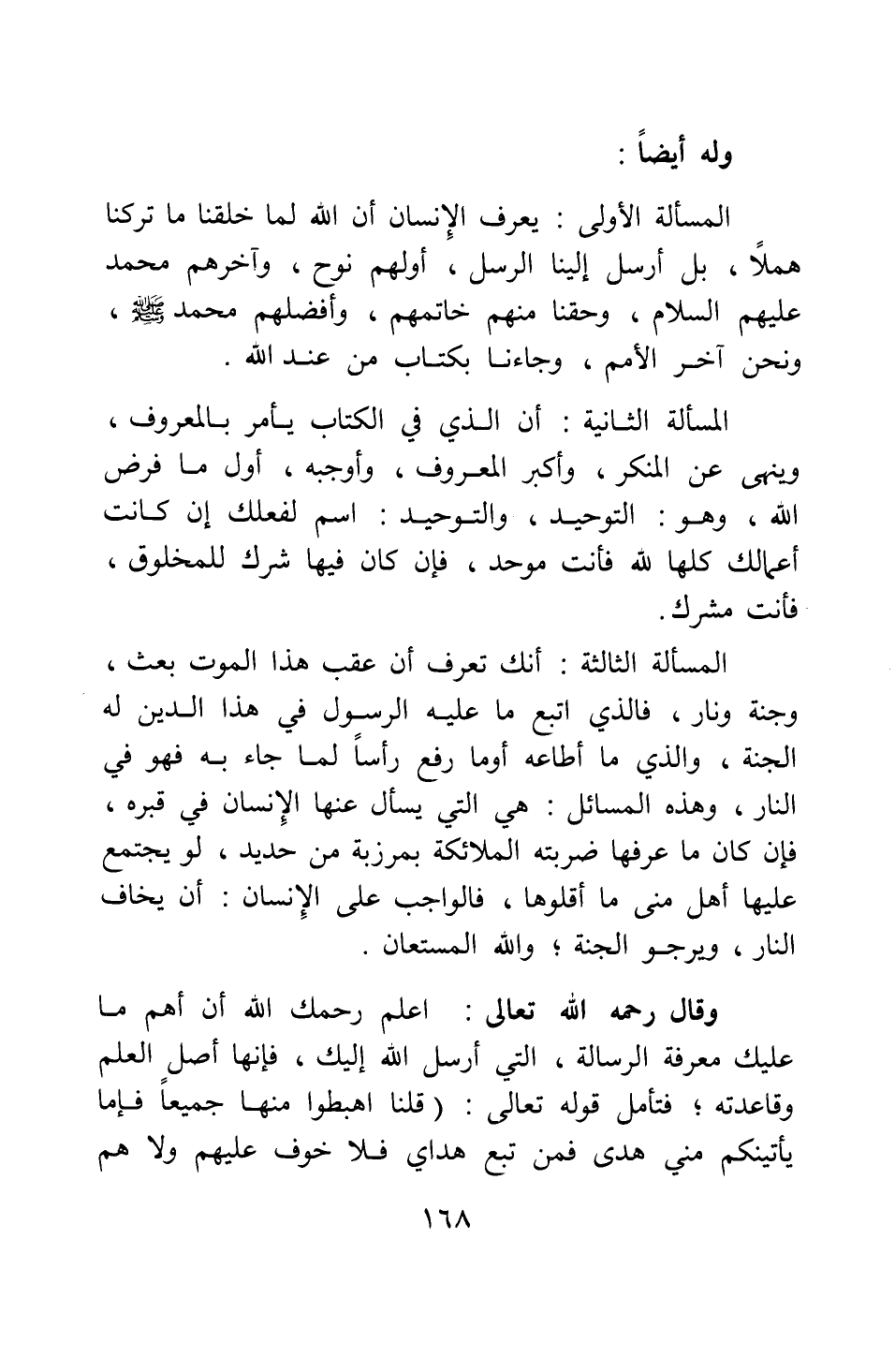 وقال رحمه الله تعالى: اعلم رحمك الله أن أهم ما عليك معرفة الرسالة، التي أرسل الله إليك، فإنها أصل العلم وقاعدته، فتأمل قوله تعالى: {قُلْنَا اهْبِطُوا مِنْهَا جَمِيعاً فَإِمَّا يَأْتِيَنَّكُمْ مِنِّي هُدىً فَمَنْ تَبِعَ هُدَايَ فَلا خَوْفٌ عَلَيْهِمْ وَلا هُمْ