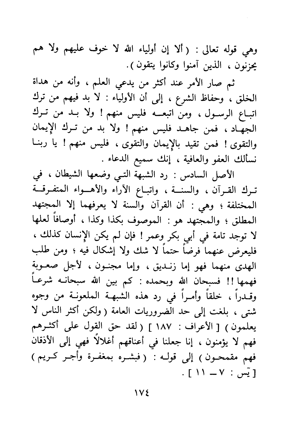 وهي قوله تعالى: {أَلا إِنَّ أَوْلِيَاءَ اللَّهِ لا خَوْفٌ عَلَيْهِمْ وَلا هُمْ يَحْزَنُونَ الَّذِينَ آمَنُوا وَكَانُوا يَتَّقُونَ} [سورة يونس آية: 62-63] . ثم صار الأمر عند أكثر من يدعي العلم، وأنه من هداة الخلق، وحفاظ الشرع، إلى أن الأولياء لا بد فيهم من ترك اتباع الرسول، ومن اتبعه فليس منهم! ولا بد من ترك الجهاد، فمن جاهد فليس منهم! ولا بد من ترك الإيمان والتقوى، فمن تقيد بالإيمان والتقوى، فليس منهم! يا ربنا نسألك العفو والعافية، إنك سميع الدعاء.