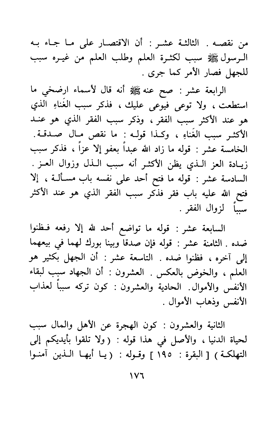 الرابعة عشر: صح عنه صلى الله عليه وسلم أنه قال لأسماء (ارضخي ما استطعت، ولا توعي فيوعى عليك) ، فذكر سبب الغناء الذي هو عند الأكثر سبب الفقر، وذكر سبب الفقر الذي هو عند الأكثر سبب الغناء، وكذا قوله: (ما نقص مال صدقة) .