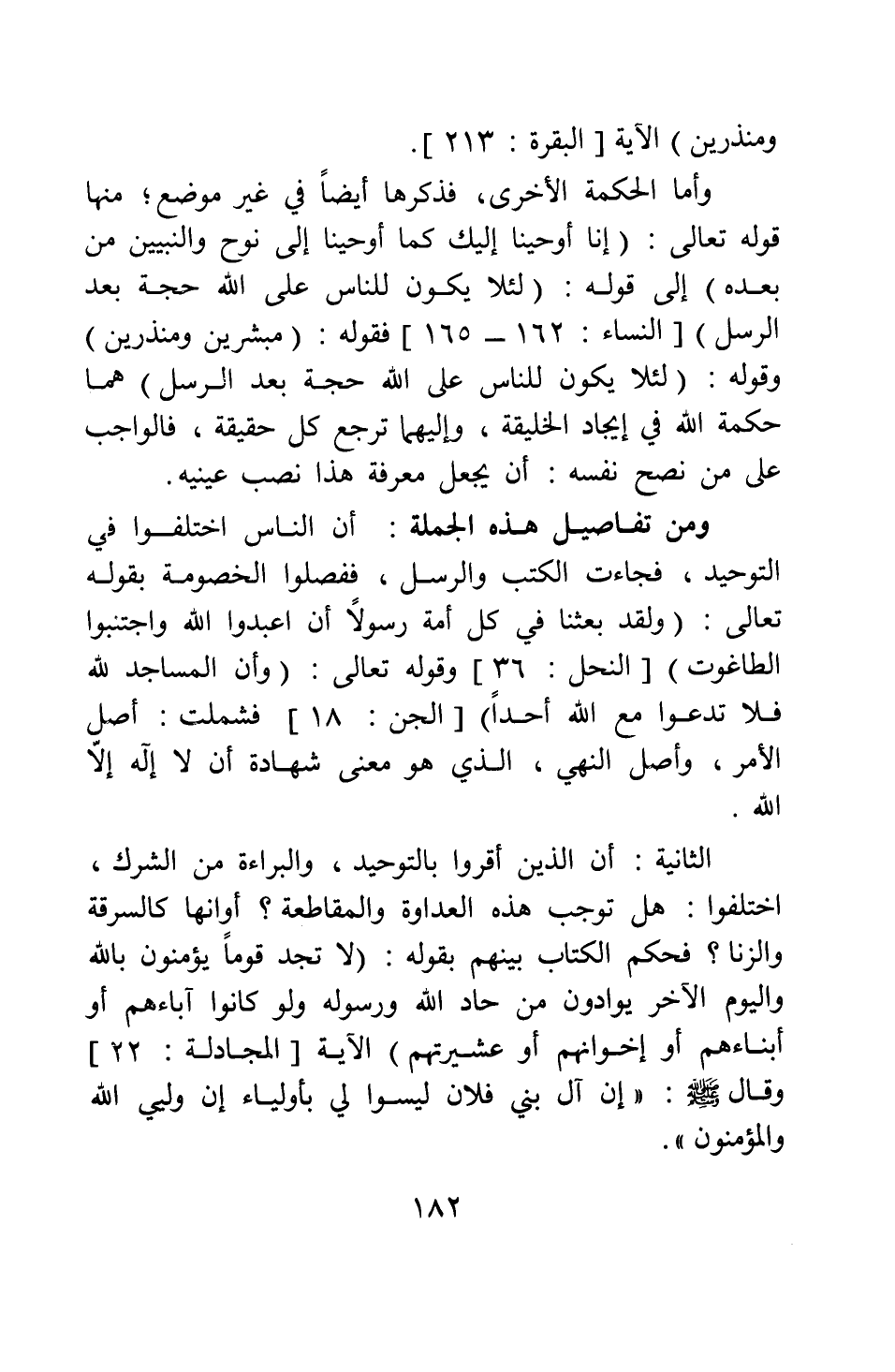 وأما الحكمة الأخرى، فذكرها أيضا في غير موضع، منها قوله تعالى: {إِنَّا أَوْحَيْنَا إِلَيْكَ كَمَا أَوْحَيْنَا إِلَى نُوحٍ وَالنَّبِيِّينَ مِنْ بَعْدِهِ} [سورة النساء آية: 163] إلى قوله: {لِئَلاَّ يَكُونَ لِلنَّاسِ عَلَى اللَّهِ حُجَّةٌ بَعْدَ الرُّسُلِ} [سورة النساء آية: 165] . فقوله: {مُبَشِّرِينَ وَمُنْذِرِينَ} [سورة البقرة آية: 213] . وقوله: {لِئَلاَّ يَكُونَ لِلنَّاسِ عَلَى اللَّهِ حُجَّةٌ بَعْدَ الرُّسُلِ} [سورة النساء آية: 165] ، هما حكمة الله في إيجاد الخليقة، وإليهما ترجع كل حقيقة. فالواجب على من نصح نفسه أن يجعل معرفة هذا نصب عينيه.