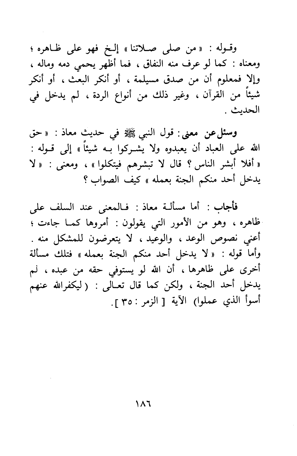 فأجاب: أما مسألة معاذ: فالمعنى عند السلف على ظاهره، وهو من الأمور التي يقولون: أمروها كما جاءت، أعني نصوص الوعد والوعيد، لا يتعرضون للمشكل منه.