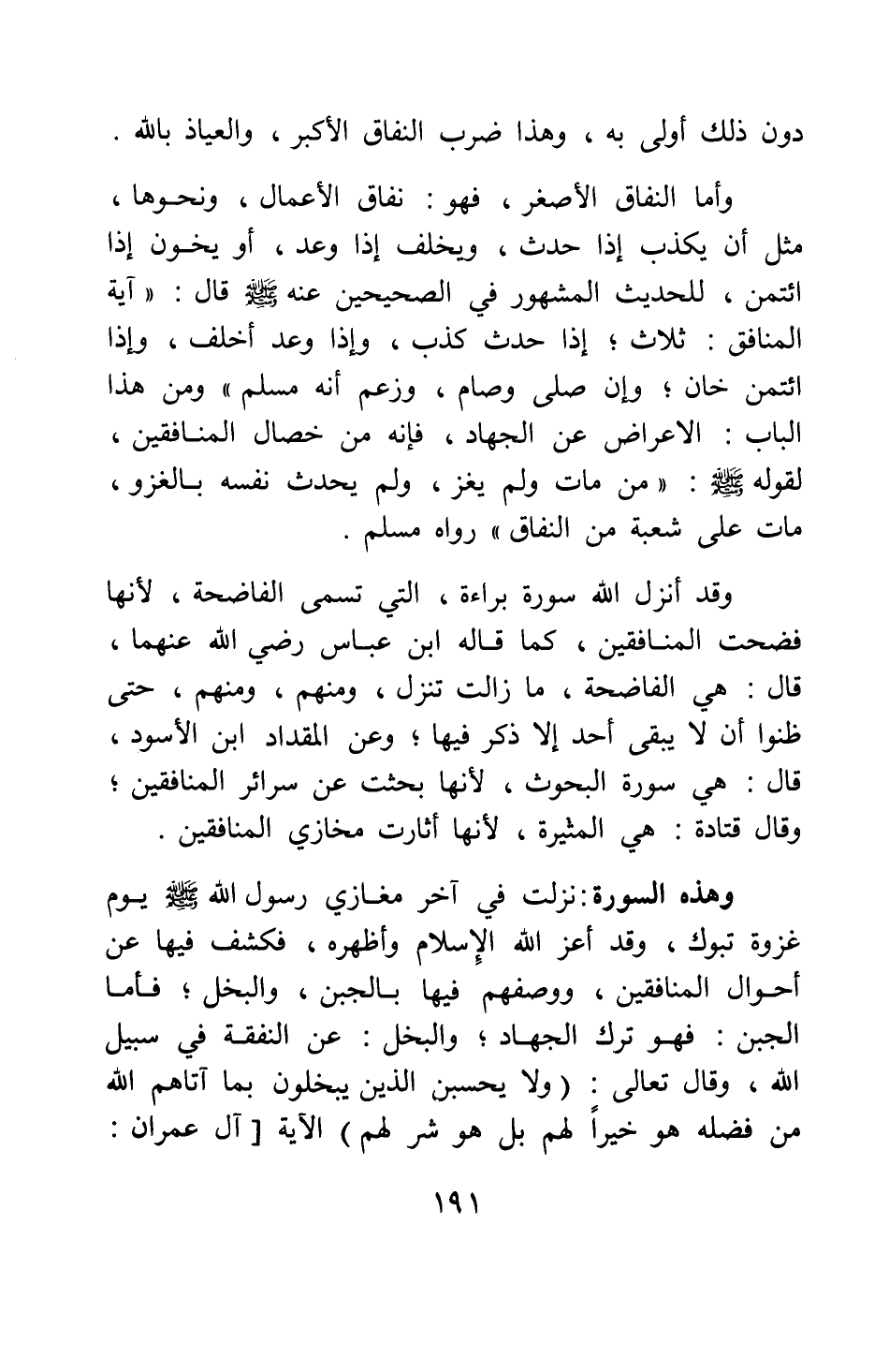 وهذه السورة نزلت في آخر مغازي رسول الله صلى الله عليه وسلم يوم غزوة تبوك، وقد أعز الله الإسلام وأظهره، فكشف فيها عن أحوال المنافقين ووصفهم فيها بالجبن والبخل، فأما الجبن فهو ترك الجهاد، والبخل عن النفقة في سبيل الله، وقال تعالى: {وَلا يَحْسَبَنَّ الَّذِينَ يَبْخَلُونَ بِمَا آتَاهُمُ اللَّهُ مِنْ فَضْلِهِ هُوَ خَيْراً لَهُمْ بَلْ هُوَ شَرٌّ لَهُمْ} الآية [سورة آل عمران آية