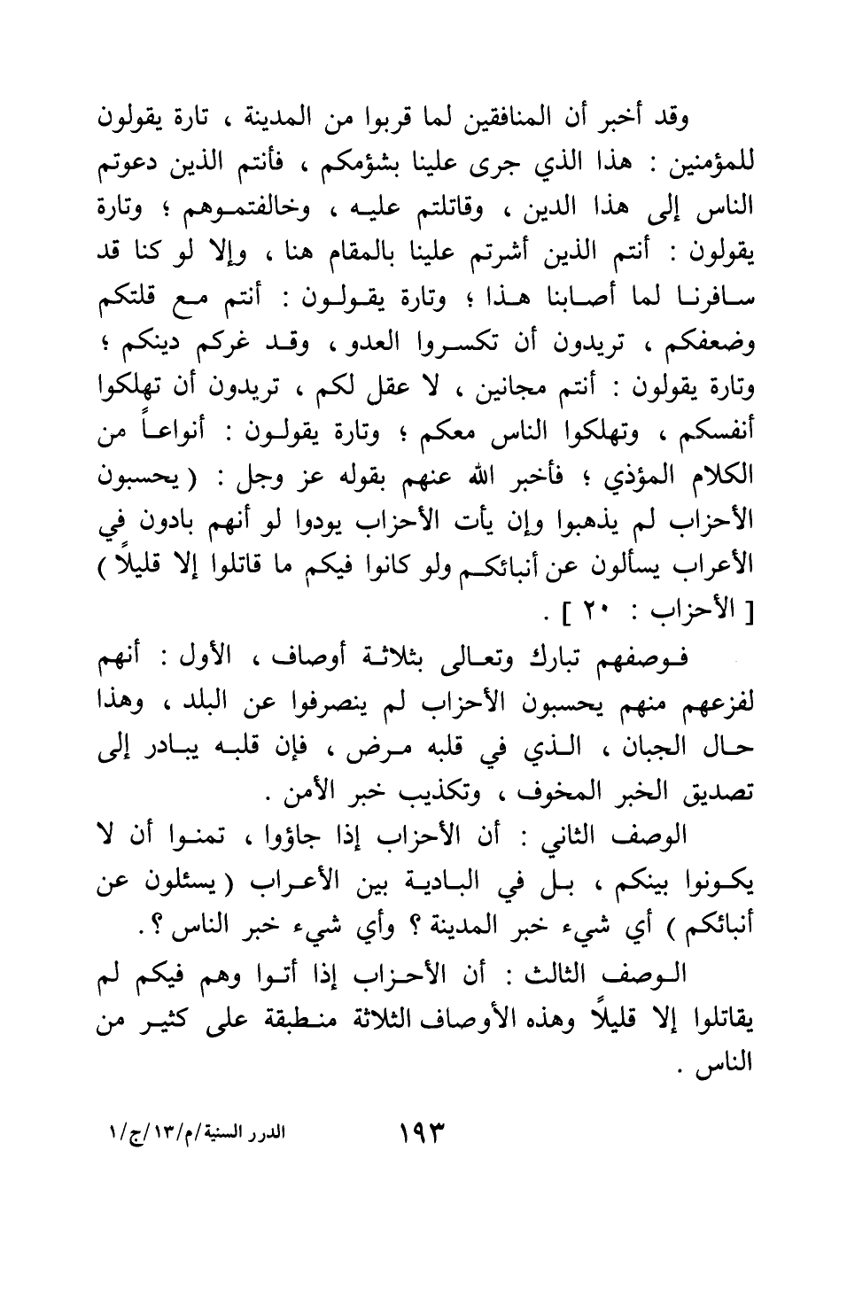 الوصف الثاني: أن الأحزاب إذا جاؤوا، تمنوا أن لا يكونوا بينكم، بل في البادية بين الأعراب، {يَسْأَلونَ عَنْ أَنْبَائِكُمْ} [سورة الأحزاب آية: 20] ، أي شيء خبر المدينة؟ وأي شيء خبر الناس؟ الوصف الثالث: أن الأحزاب إذا أتوا وهم فيكم لم يقاتلوا إلا قليلا وهذه الأوصاف الثلاثة منطبقة على كثير من الناس.