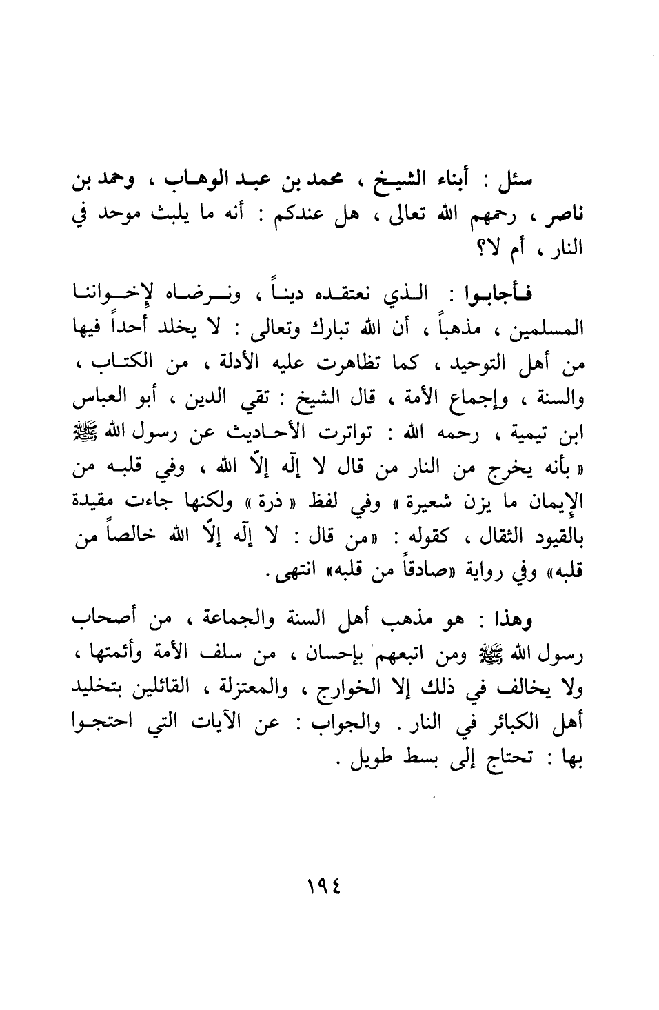 سئل أبناء الشيخ محمد بن عبد الوهاب وحمد بن ناصر رحمهم الله تعالى: هل عندكم أنه ما يلبث موحد في النار، أم لا؟