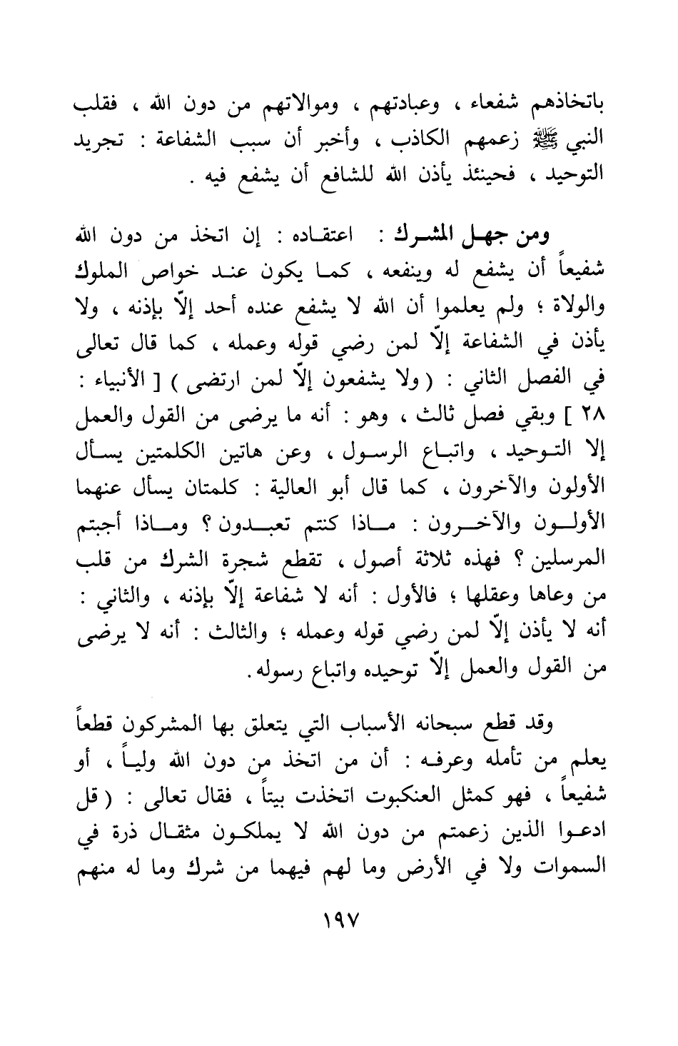 ومن جهل المشرك اعتقاده إن اتخذ من دون الله شفيعا أن يشفع له وينفعه، كما يكون عند خواص الملوك والولاة، ولم يعلموا أن الله لا يشفع عنده أحد إلا بإذنه، ولا يأذن في الشفاعة إلا لمن رضي قوله وعمله، كما قال تعالى في الفصل الثاني: {وَلا يَشْفَعُونَ إِلاَّ لِمَنِ ارْتَضَى} [سورة الأنبياء آية: 28] . وبقي فصل ثالث، وهو: أنه ما يرضى من القول والعمل إلا التوحيد، واتباع الرسول، وعن هاتين الكلمتين يسأل الأولون والآخرون، كما قال أبو العالية: