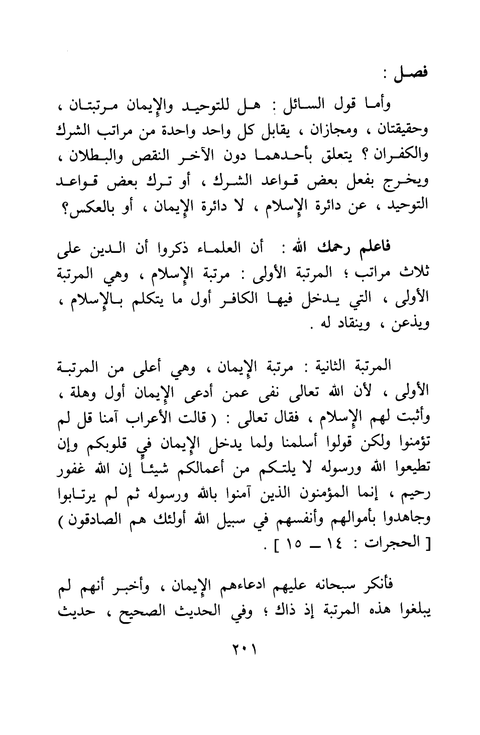 وأما قول السائل: هل للتوحيد والإيمان مرتبتان، وحقيقتان، ومجازان، يقابل كل واحد واحدة من مراتب الشرك والكفران، يتعلق بأحدهما دون الآخر النقص والبطلان، ويخرج بفعل بعض قواعد الشرك، أو ترك بعض قواعد التوحيد، عن دائرة الإسلام، لا دائرة الإيمان، أو بالعكس؟