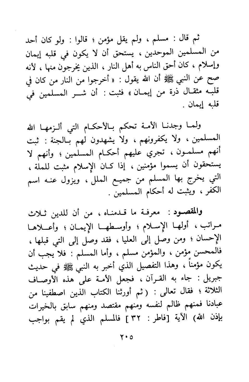والمقصود معرفة ما قدمناه، من أن للدين ثلاث مراتب: أولها الإسلام، وأوسطها الإيمان، وأعلاها الإحسان. ومن وصل إلى العليا فقد وصل إلى التي قبلها؛ فالمحسن مؤمن، والمؤمن مسلم، وأما المسلم فلا يجب أن يكون مؤمنا. وهذا التفصيل الذي أخبر به النبي صلى الله عليه وسلم في حديث جبريل جاء به القرآن، فجعل الأمة على هذه الأوصاف الثلاثة ; فقال تعالى: {ثُمَّ أَوْرَثْنَا الْكِتَابَ الَّذِينَ اصْطَفَيْنَا مِنْ عِبَادِنَا فَمِنْهُمْ ظَالِمٌ لِنَفْسِهِ وَمِنْهُمْ مُقْتَصِدٌ وَمِنْهُمْ سَابِقٌ بِالْخَيْرَاتِ} الآية [سورة فاطر آية: 32] . فالمسلم الذي لم يقم بواجب
