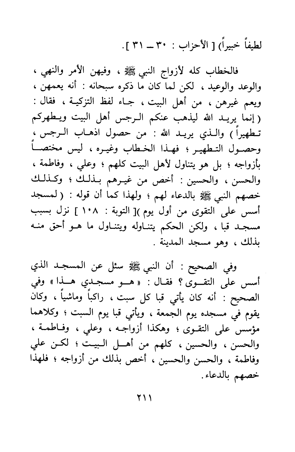 وفي الصحيح: " أن النبي صلى الله عليه وسلم سئل عن المسجد الذي أسس على التقوى، فقال: هو مسجدي هذا " 1. وفي الصحيح: " أنه كان يأتي قباء كل سبت، راكبا وماشيا، وكان يقوم في مسجده يوم الجمعة، ويأتي قباء يوم السبت " 2 وكلاهما مؤسس على التقوى. وهكذا أزواجه، وعلي، وفاطمة، والحسن، والحسين، كلهم من أهل البيت، لكن علي وفاطمة، والحسن والحسين، أخص بذلك من أزواجه ; فلهذا خصهم بالدعاء.