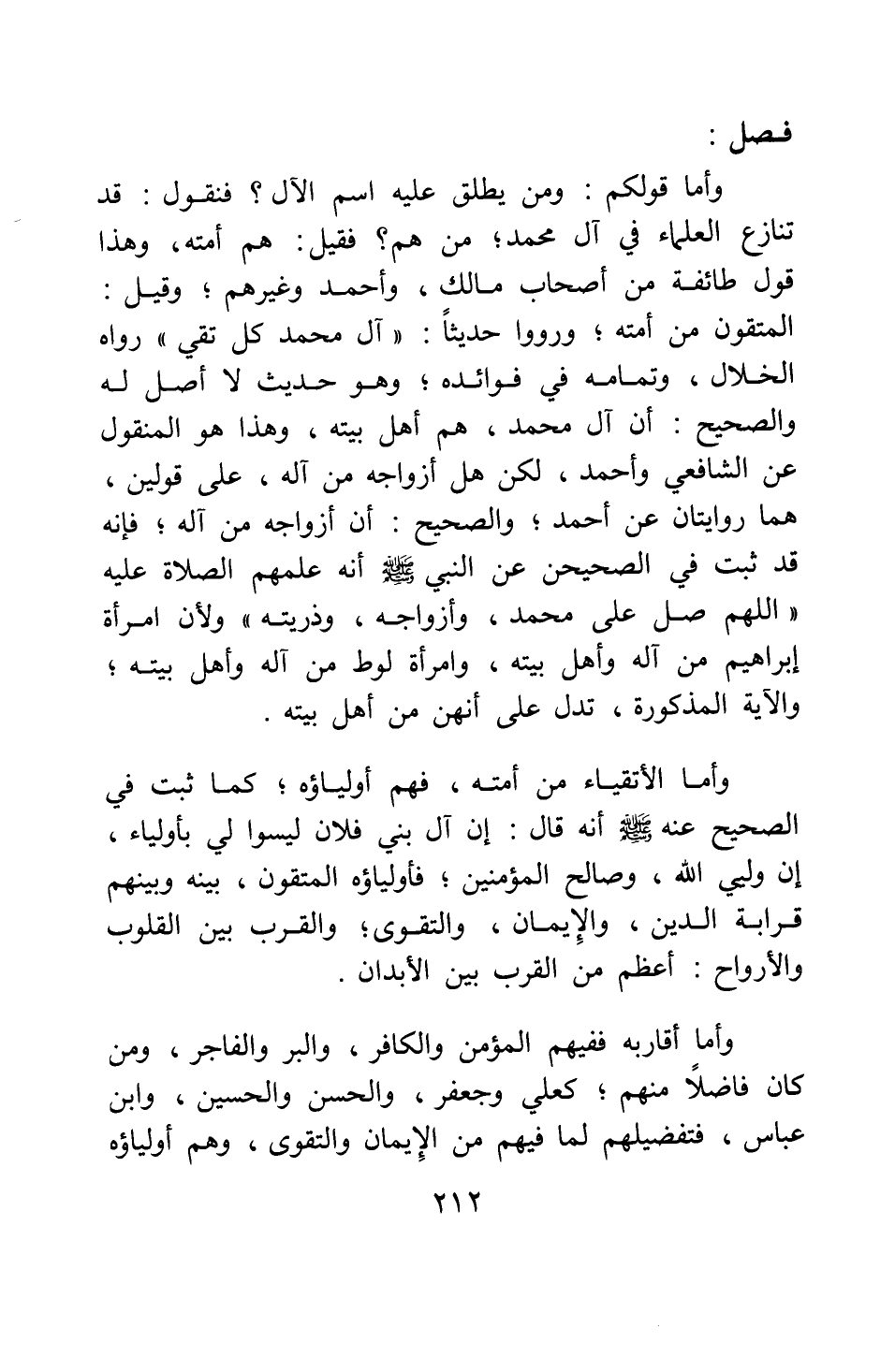 وأما قولكم: ومن يطلق عليه اسم الآل؟ فنقول: قد تنازع العلماء في آل محمد مَنْ هم؟ فقيل: هم أمته، وهذا قول طائفة من أصحاب مالك، وأحمد وغيرهم. وقيل: المتقون من أمته ; ورووا حديثا: " آل محمد كل تقي " رواه الخلال، وتمامه في فوائده، وهو حديث لا أصل له. والصحيح أن آل محمد هم أهل بيته، وهذا هو المنقول عن الشافعي وأحمد، لكن هل أزواجه من آله؟ على قولين هما روايتان عن أحمد، والصحيح أن أزواجه من آله، فإنه قد ثبت في الصحيحين عن النبي صلى الله عليه وسلم أنه علمهم الصلاة عليه: " اللهم صل على محمد، وأزواجه، وذريته " 1؛ ولأن امرأة إبراهيم من آله وأهل بيته، وامرأة لوط من آله وأهل بيته، والآية المذكورة، تدل على أنهن من أهل بيته.