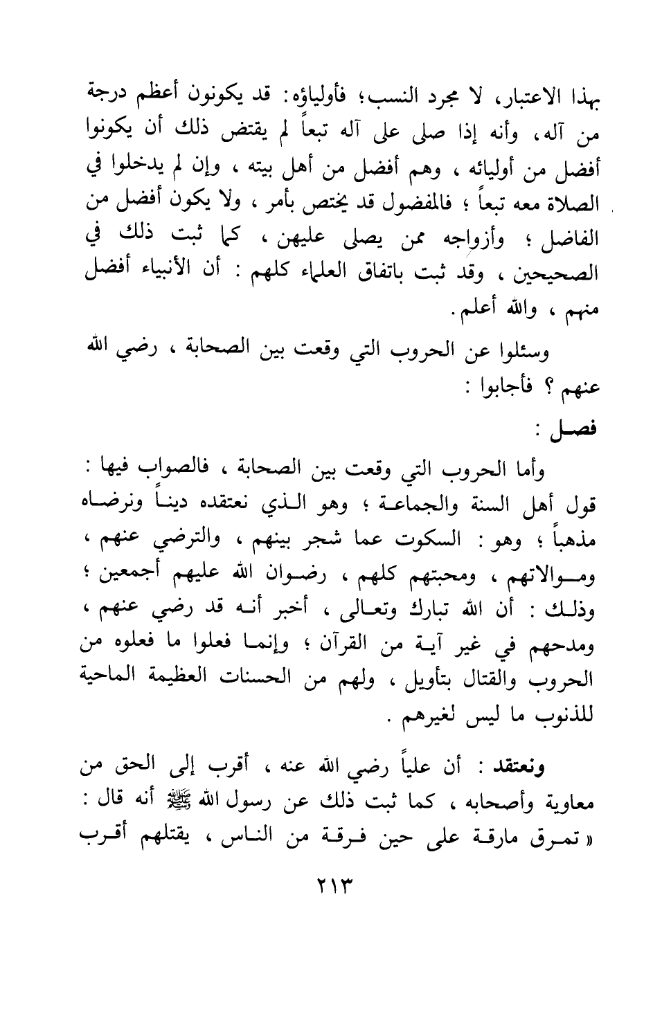 فصل: وأما الحروب التي وقعت بين الصحابة، فالصواب فيها قول أهل السنة والجماعة، وهو الذي نعتقده دينا ونرضاه مذهبا؛ وهو السكوت عما شجر بينهم، والترضي عنهم، وموالاتهم، ومحبتهم كلهم، رضوان الله عليهم أجمعين. وذلك أن الله تبارك وتعالى، أخبر أنه قد رضي عنهم، ومدحهم في غير آية من القرآن ; وإنما فعلوا ما فعلوه من الحروب والقتال بتأويل، ولهم من الحسنات العظيمة الماحية للذنوب ما ليس لغيرهم.